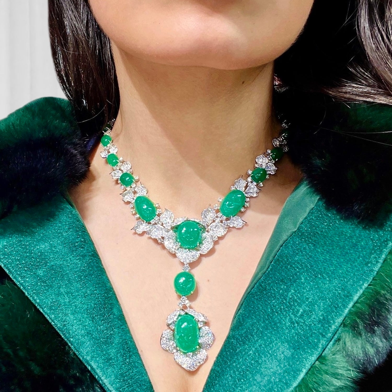 An opulent cascade of cabochon emeralds and diamonds, meticulously composed with masterful craftsmanship and exquisite attention to detail