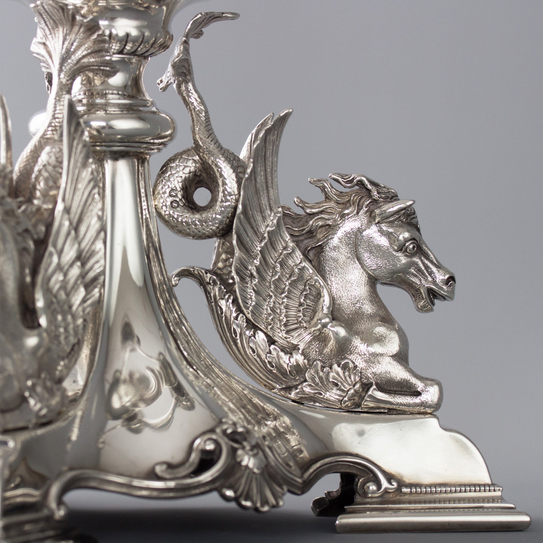 Reimagine antique silver in fresh settings. An important pair of silver entree dishes by Paul Storr, London 1826, their cast handles in the form of heraldic leopard heads, are set for a modern botanical take on the dining table. Together with a set of 4 cast candlesticks by William Cafe, and a victorian carving knife and fork, from a larger canteen of silver flatware.