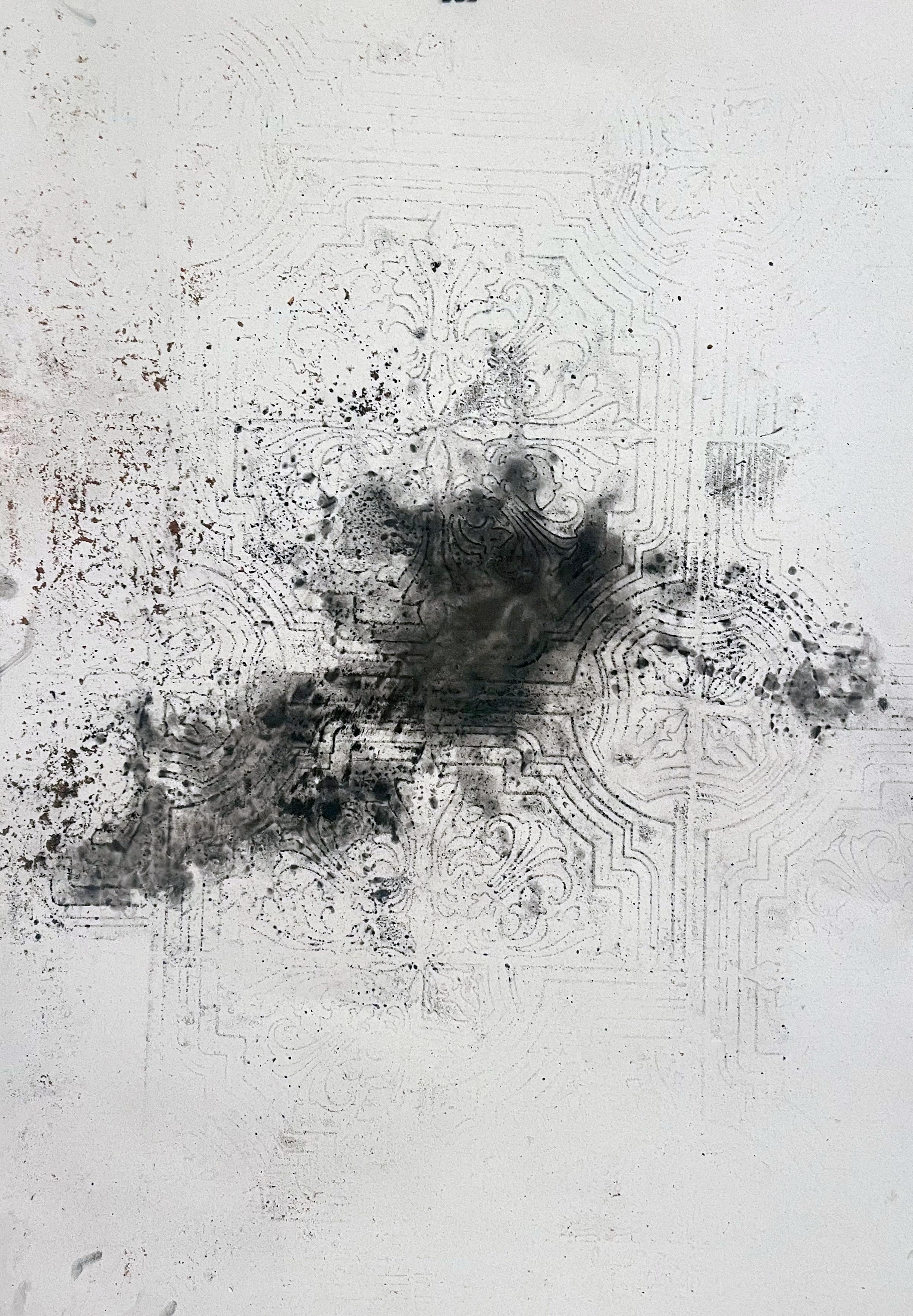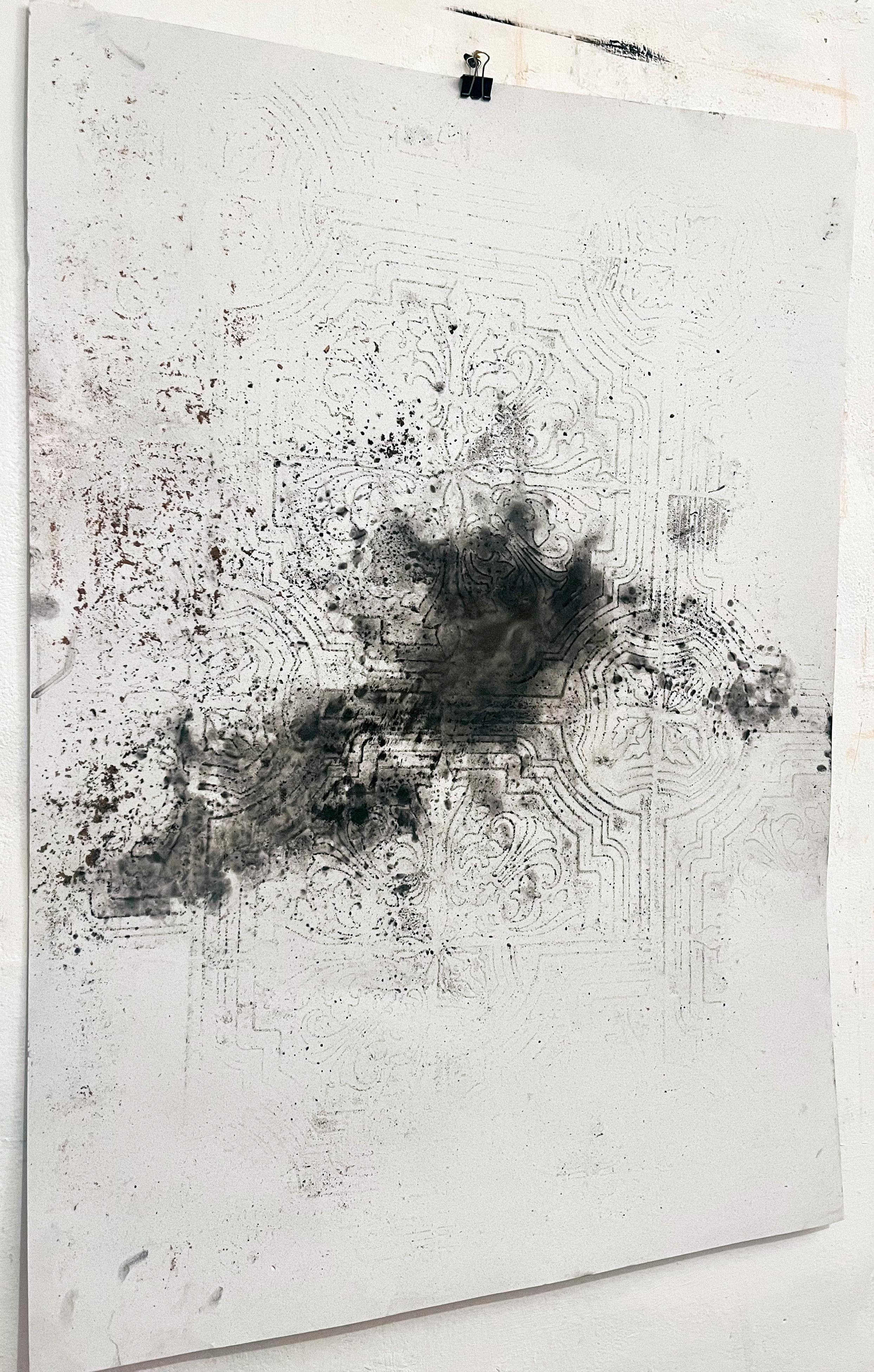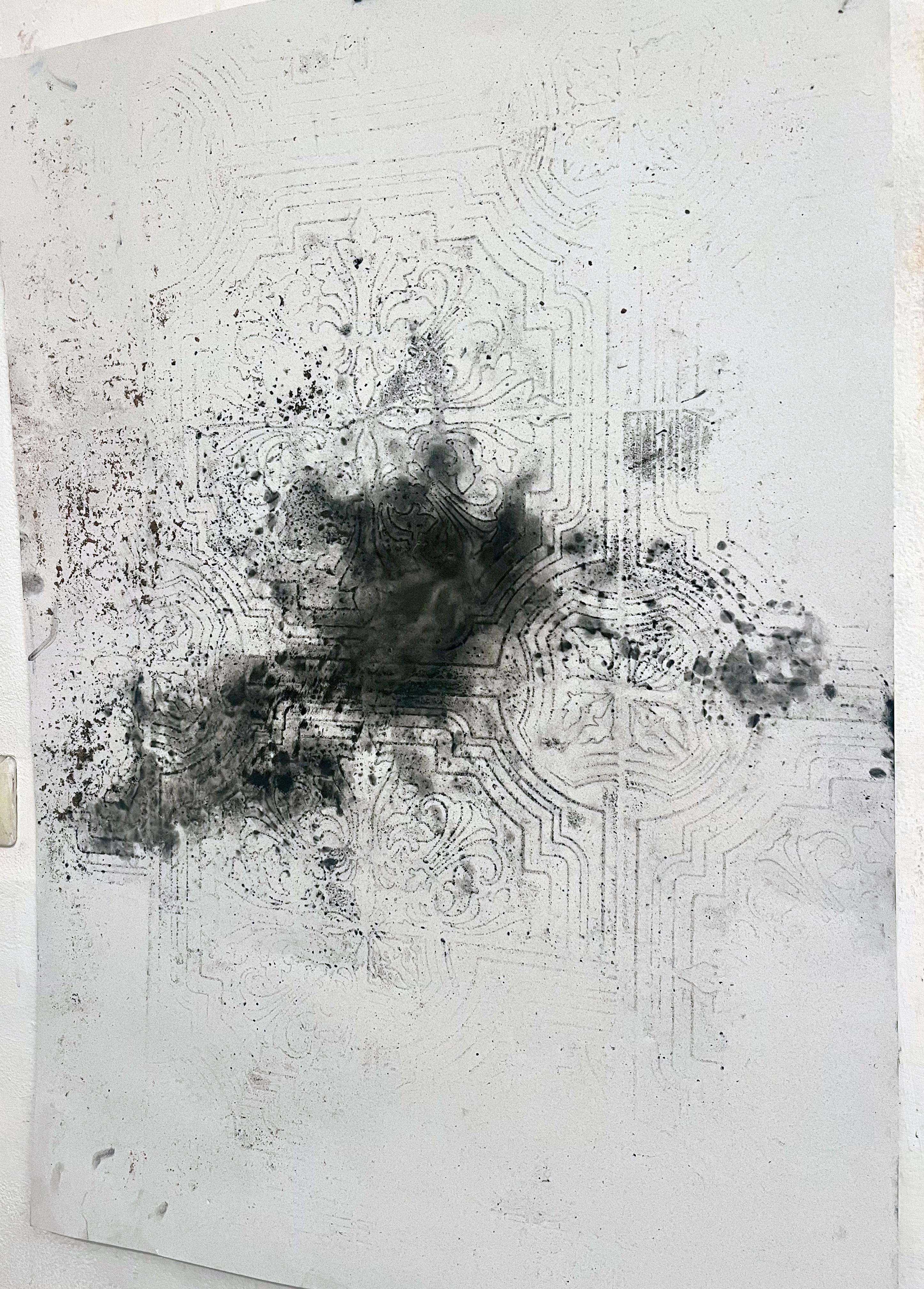 Tinta negra sobre papel, agua de mar, fractal, dibujos imposibles y poéticos