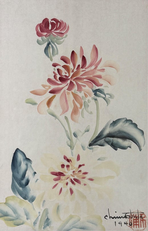 Ver todo"Dalias" Chiura Obata, Japonesa Americana, Delicado Trabajo Floral Rojo y Azul