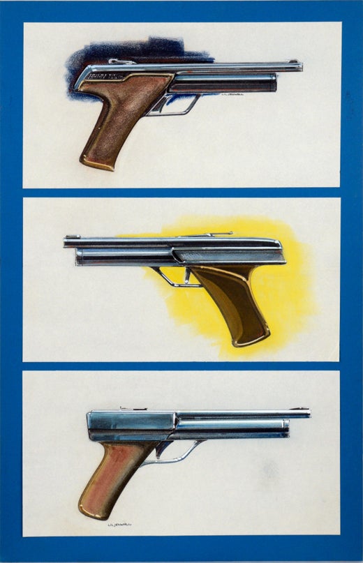 Tres ilustraciones con calidad de diseño de pistolas de aire comprimido de la marca Hahn (Steyr-Hahn), de Edward T. Liljenwall (estadounidense, 1943-2010). Cada pistola está expertamente representada, con un sombreado suave y detalles específicos. Diseño prototipo de una pistola Hahn co2 Pellgun que creó como proyecto escolar; resulta que los ejemplares actuales utilizan este diseño similar. Los reflejos del metal se añaden con aguada, creando un reflejo de aspecto realista.