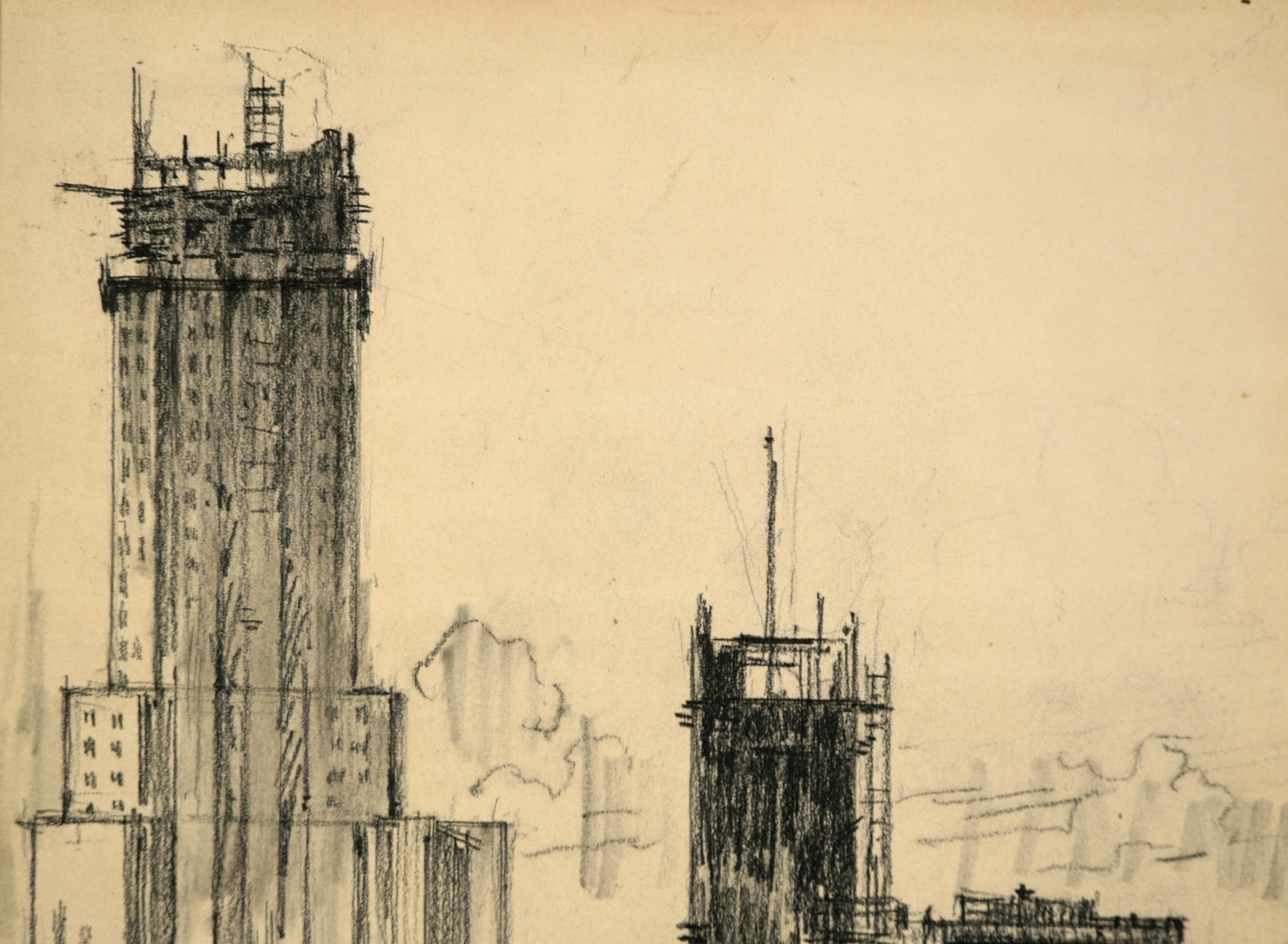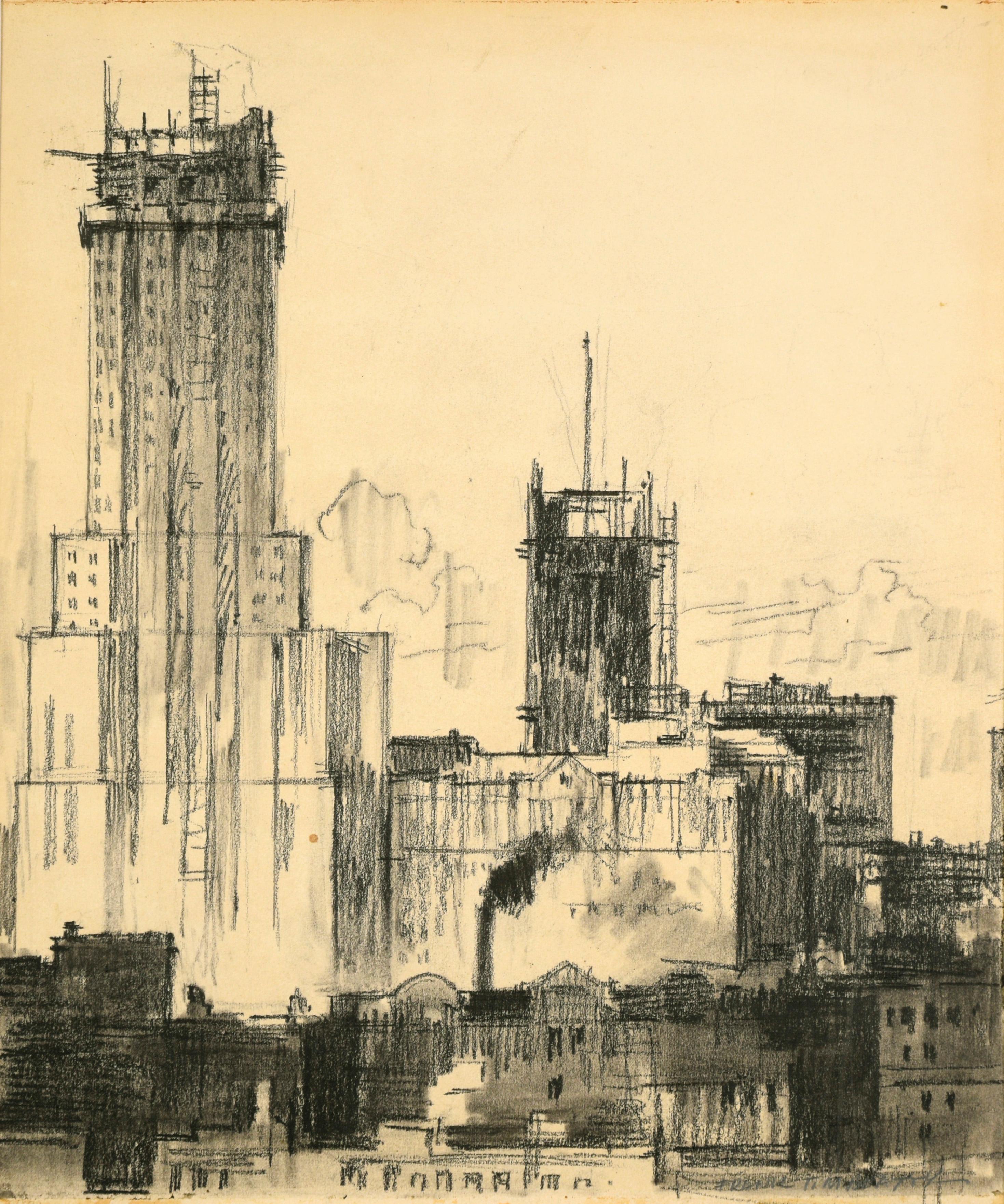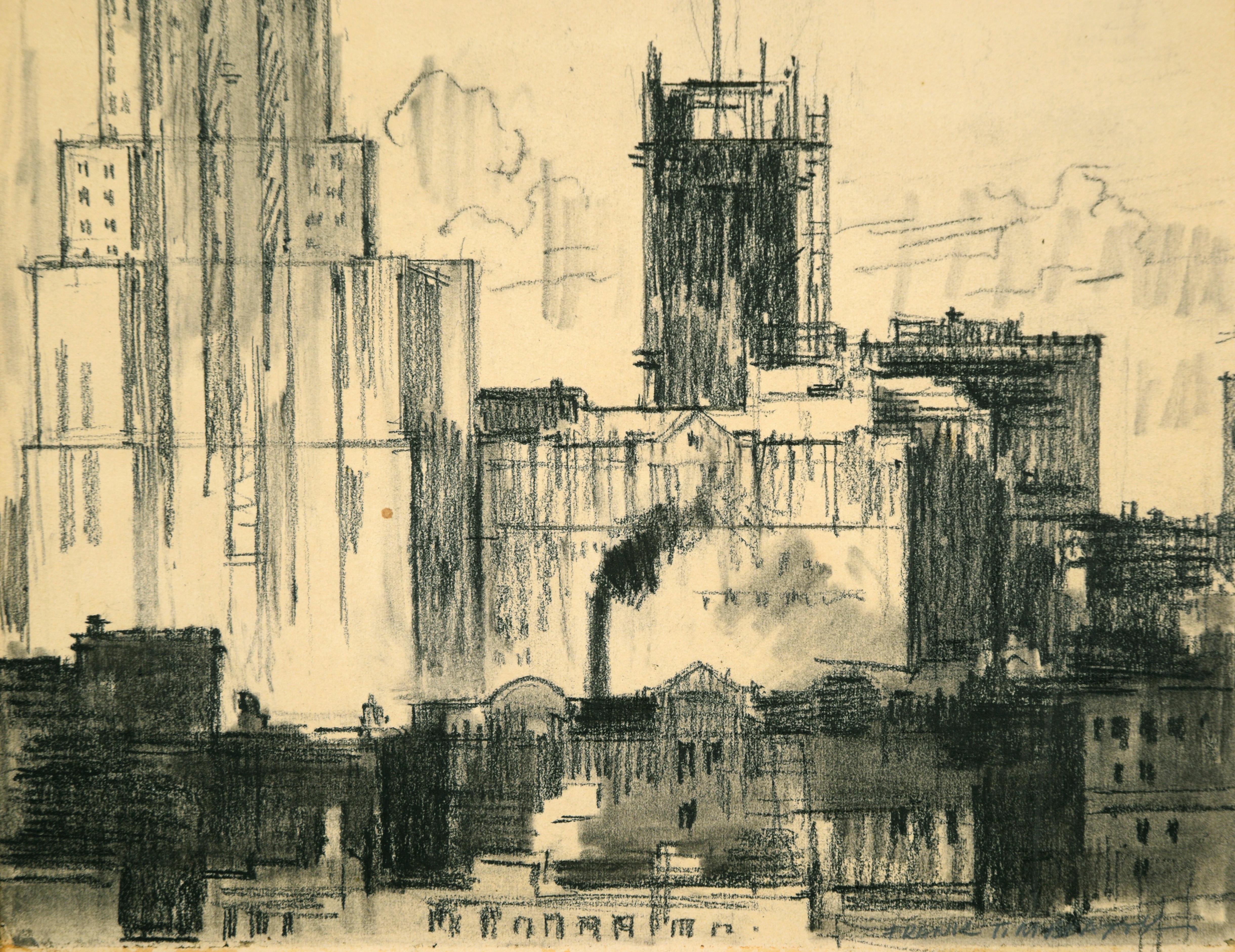 Dibujo de arquitectura hábilmente realizado por Frank Tim Beatty (estadounidense, n. 1899, m. 1984). La escena representa dos rascacielos en construcción al fondo con edificios de fábricas más bajos en primer plano, posiblemente el edificio Wrigley de Chicago y la Torre Tribune en construcción con la fábrica de jabón Kirk de North Water Street (que fue demolida en 1929) en primer plano. El dibujo está hecho en un tono negro intenso, con una mezcla de rayado cruzado y gradación que proporciona el sombreado.
