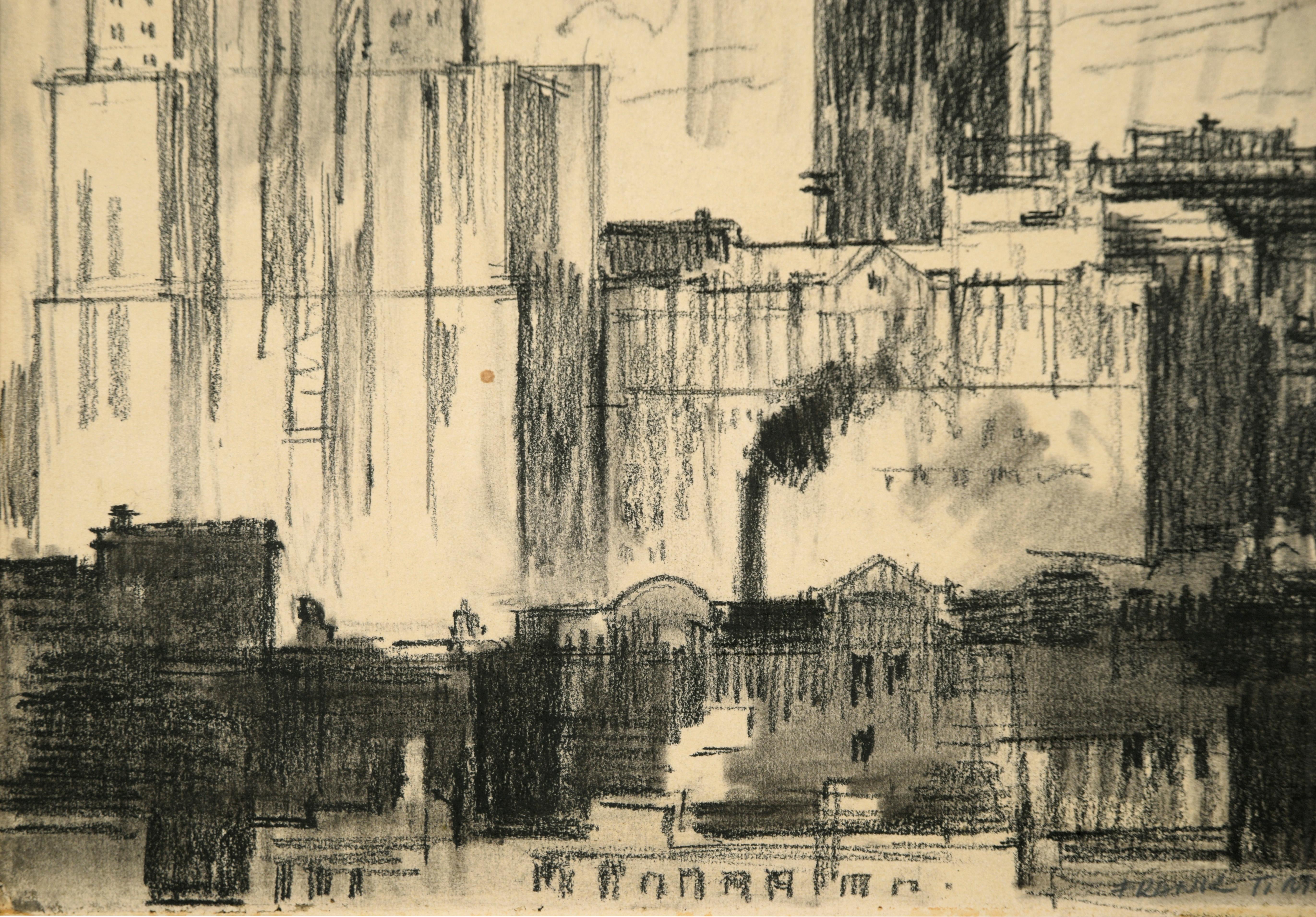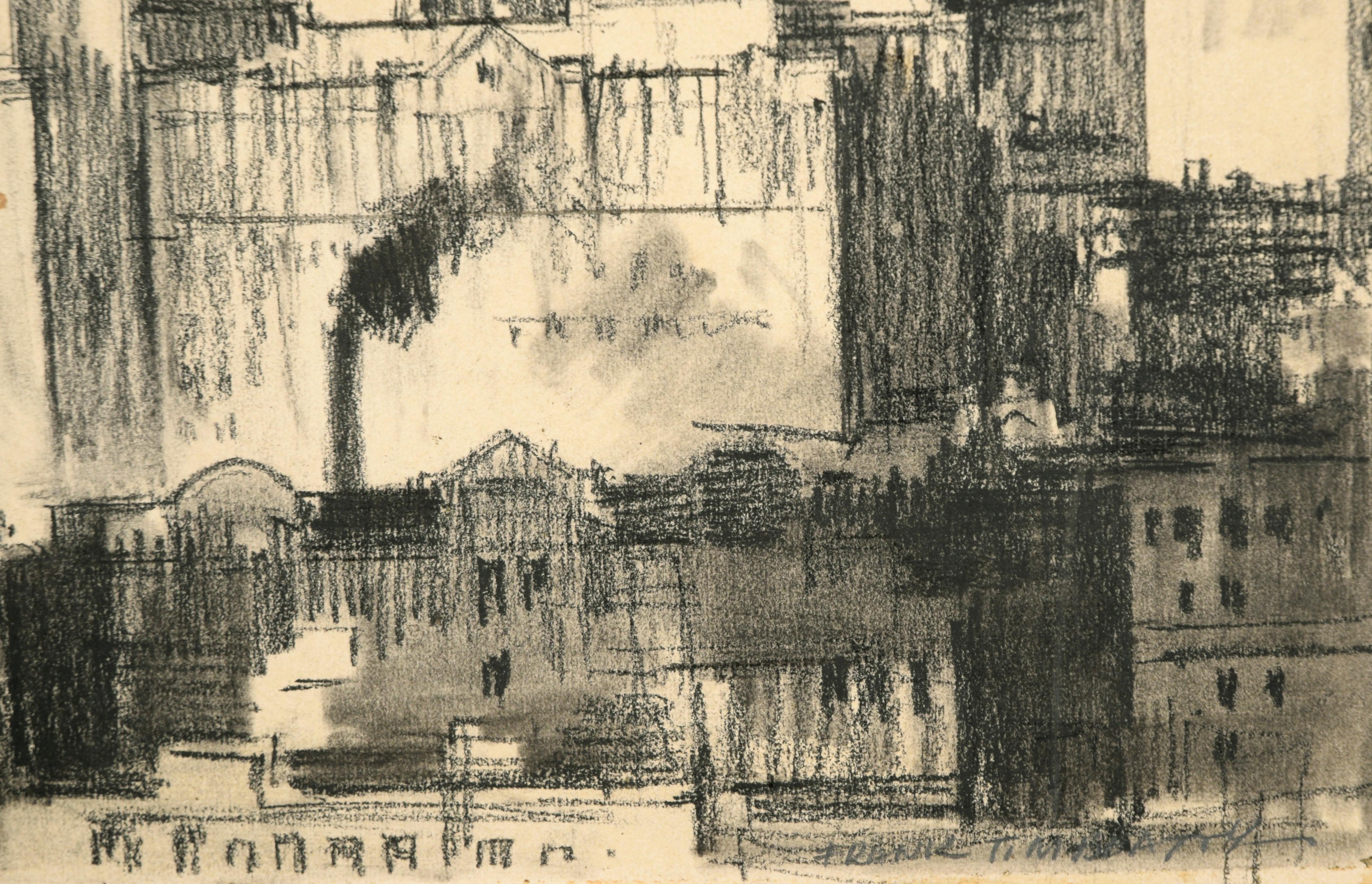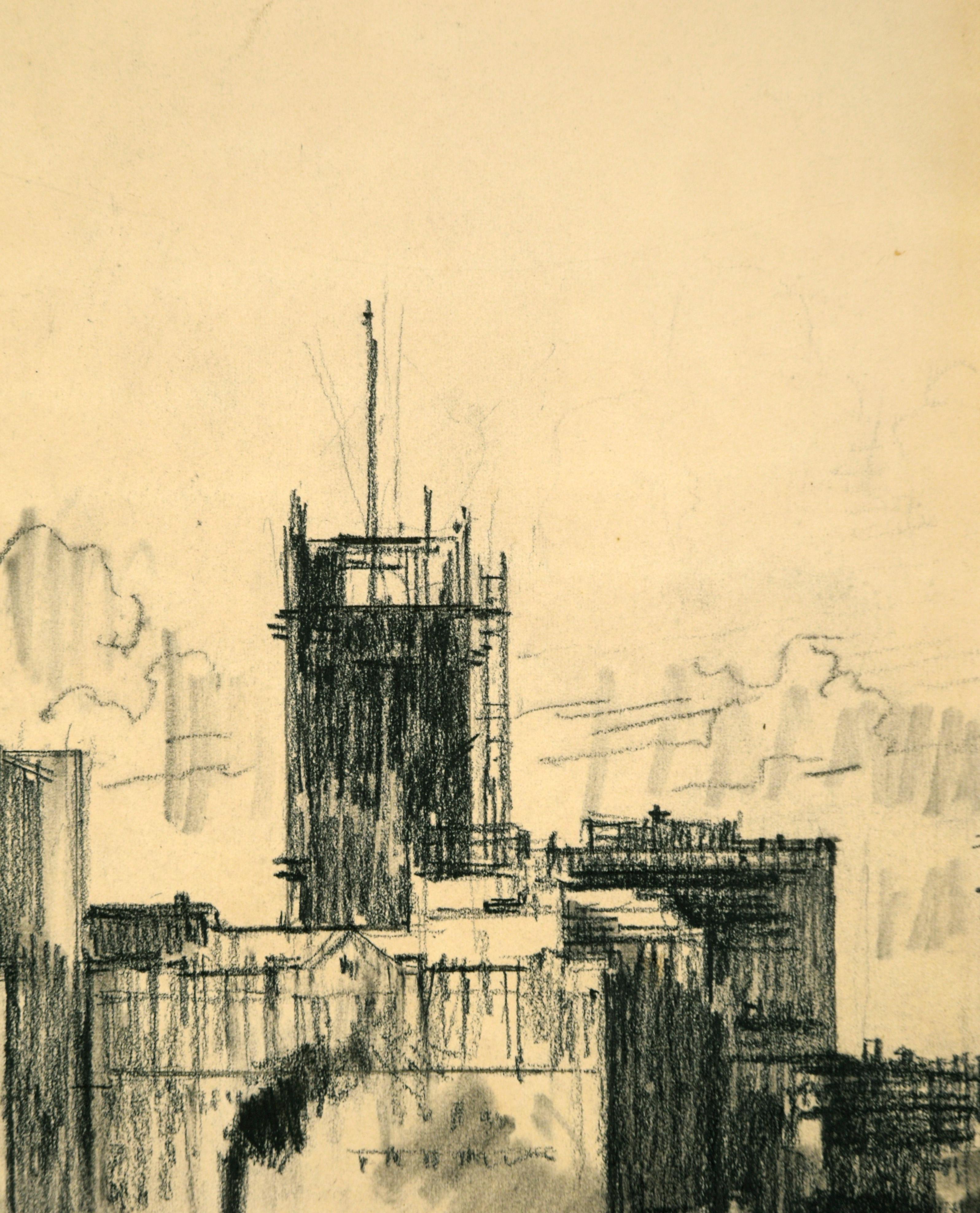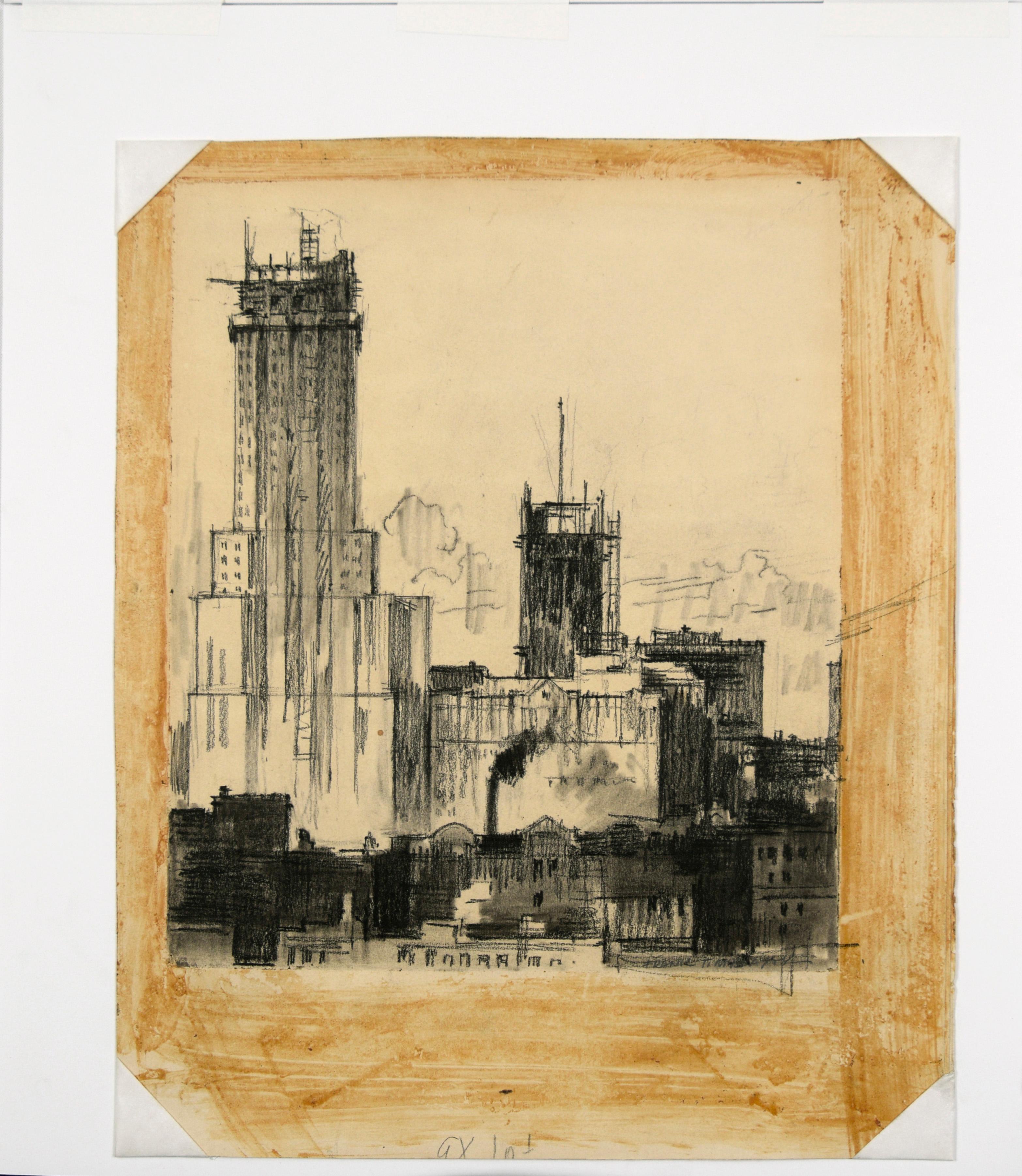 Dibujo de arquitectura hábilmente realizado por Frank Tim Beatty (estadounidense, n. 1899, m. 1984). La escena representa dos rascacielos en construcción al fondo con edificios de fábricas más bajos en primer plano, posiblemente el edificio Wrigley de Chicago y la Torre Tribune en construcción con la fábrica de jabón Kirk de North Water Street (que fue demolida en 1929) en primer plano. El dibujo está hecho en un tono negro intenso, con una mezcla de rayado cruzado y gradación que proporciona el sombreado.