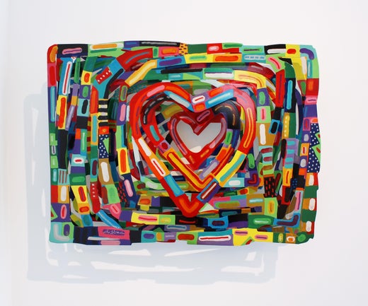 "Gota de Amor" de David Gerstein es una cautivadora escultura de pared construida sobre 3 capas que mezcla colores vibrantes y formas fluidas para simbolizar la esencia del amor y la emoción. La pieza presenta una composición dinámica, con una forma de gota en su centro, que sugiere la pureza y la profundidad del afecto. El uso que hace Gerstein de tonos atrevidos y contrastados añade energía y movimiento, mientras que las líneas fluidas evocan una sensación de conexión y unidad. Esta impactante obra de arte capta tanto la sencillez como la complejidad del amor, creando una experiencia visual poderosa y emotiva.