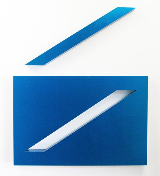 En un brillante rosa intenso, dos rectángulos verticales se sitúan uno al lado del otro "en sincronía" en esta elegante escultura de pared de la artista californiana Lori Cozen-Gelle...