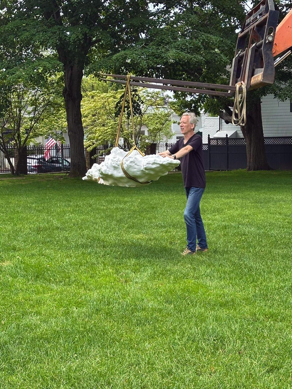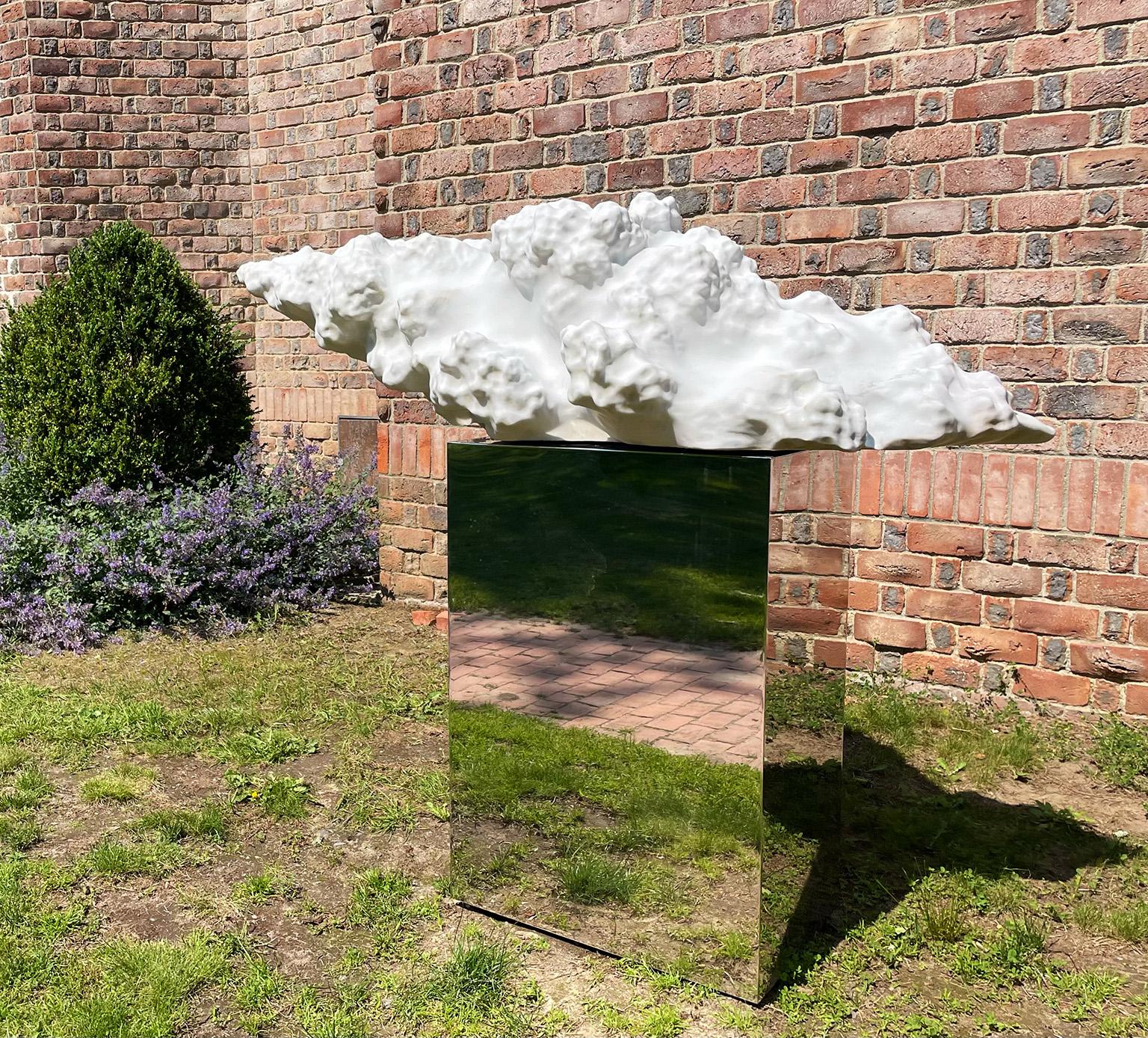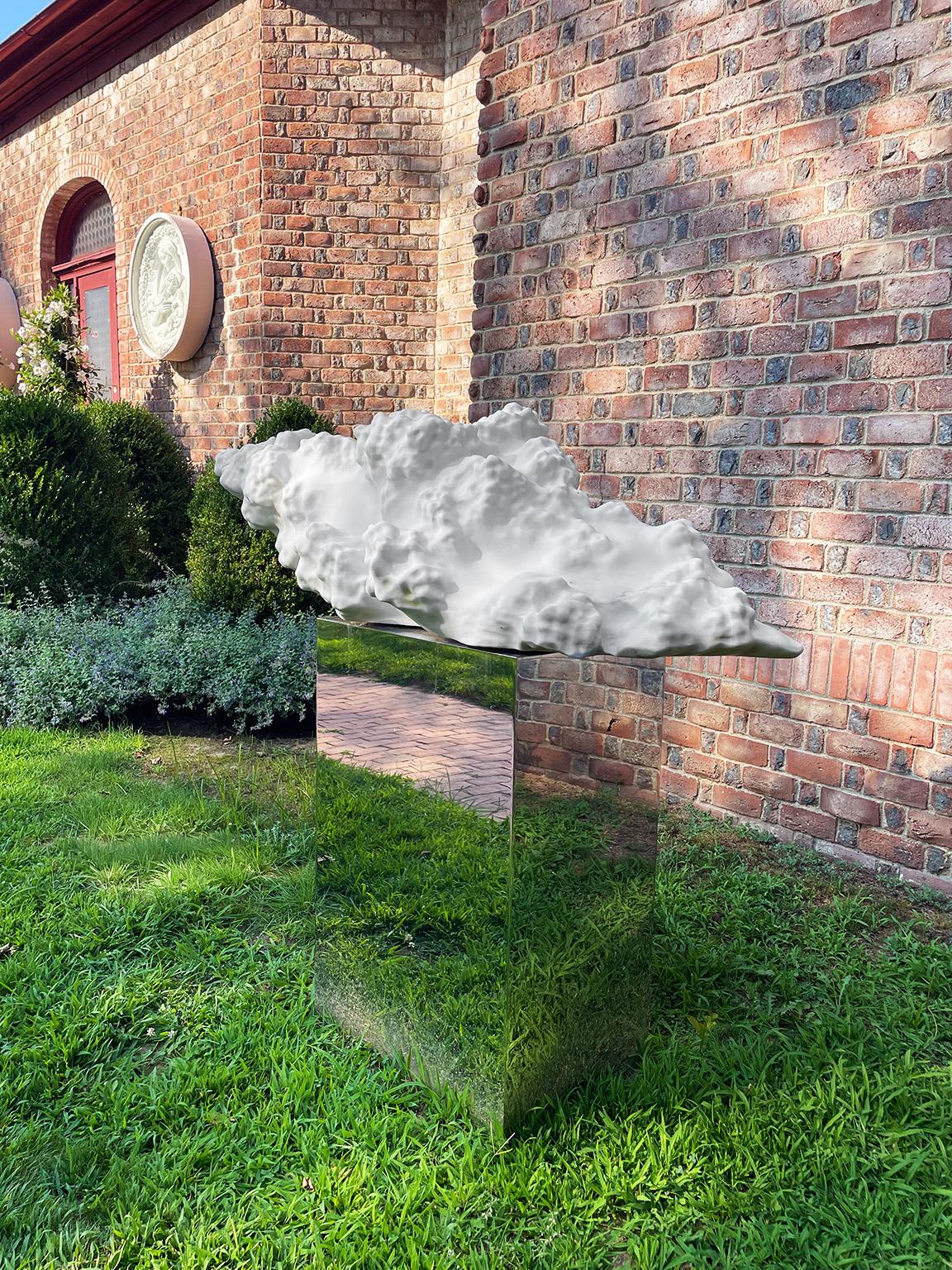 Escultura moderna, contemporánea, abstracta, orgánica, piedra, mármol, acero inoxidable, espejo, nubes, naturaleza, natural, blanco, plata, reflectante, brillante, gran tamaño, gran escala, interior, exterior