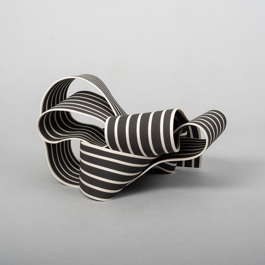 Esta escultura forma parte de la obra más reciente de la artista, en la que utiliza porcelana de papel -porcelana a la que se ha añadido un 0,5% de fibra de papel para aumentar su flexibilidad- para producir formas orgánicas, dinámicas y naturales. Se ponen a prueba los límites físicos del material (se colapsa durante la cocción) y se experimenta con el equilibrio entre los espacios llenos y vacíos que producen las formas. Aunque ensambla diversos componentes para crear sus esculturas, el resultado final tras la cocción siempre está sujeto a sorpresas debido a este proceso de colapso. El uso del color en esta escultura es un componente clave que puede provocar una respuesta emocional o psicológica en el espectador. Los patrones lineales de la superficie dirigen la atención del espectador a lo largo de las curvas, acentuando el aspecto suave, ligero y fluido.