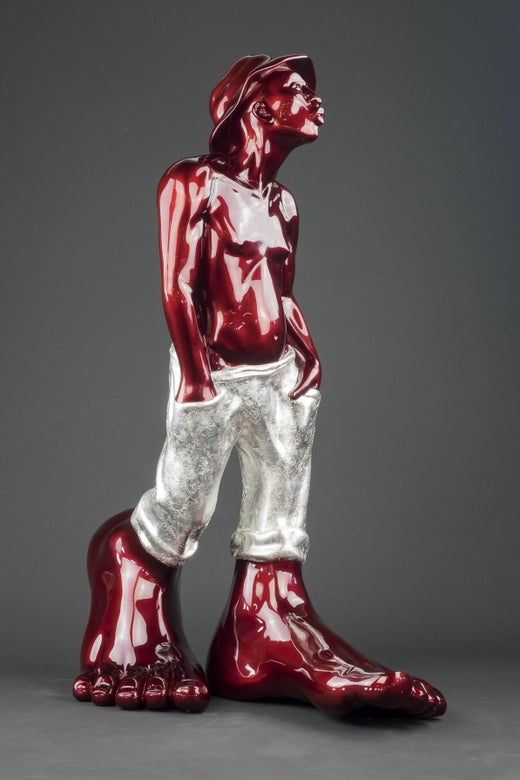 "Ladyfoot" de Idan Zareski es una escultura contemporánea icónica, que forma parte de la renombrada serie de la Familia Bigfoot. Fundida en resina de alta calidad y acabada en un llamativo rojo cromo, esta pieza de gran formato (105 x 170 x 80 cm) representa una figura femenina relajada y contemplativa, tumbada boca abajo, con la cabeza apoyada en las manos y los pies alegremente levantados. El atrevido color rojo realza las sensuales curvas y la superficie reflectante, confiriendo a la obra una presencia casi líquida que cautiva al espectador desde cualquier ángulo.