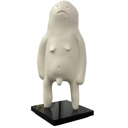 Esta escultura contemporánea presenta una figura antropomorfa estilizada con una estética minimalista, de dibujos animados. De contornos suaves y acabado monocromo limpio, la figura presenta detalles anatómicos simplificados -pezones sutiles, un ombligo y genitales masculinos- que contrastan con su forma infantil y redondeada. Con la boca hacia abajo y los ojos vacíos, la pieza transmite una tranquila sensación de melancolía y vulnerabilidad, equilibrada por su carácter juguetón y surrealista.