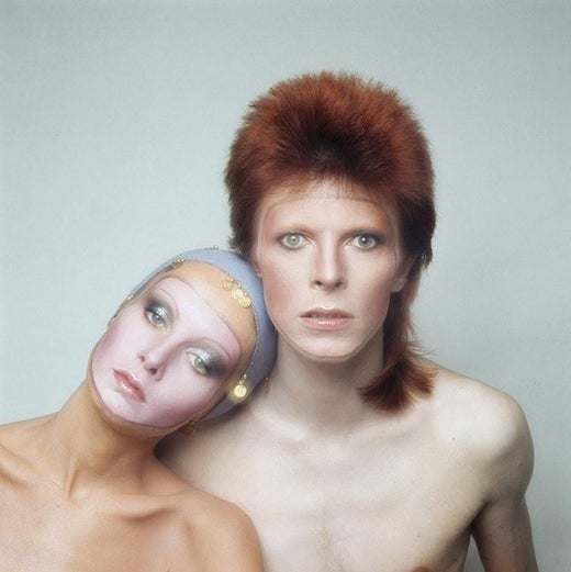 B se sentaron frente a mí me di cuenta de que teníamos un problema. Twiggy y yo acabábamos de volver de las Bahamas y ella estaba morena. David estaba blanco como un fantasma. Tenían un aspecto extraño. El problema se resolvió cuando el maquillador Pierre LaRoche y yo decidimos dibujarles máscaras en la cara de los mismos colores. ¡¡¡Cuando miré por el visor del objetivo, sólo entonces me di cuenta de que Bowie tenía los ojos de otro color!!! Todas las veces que me había encontrado con él nunca me había dado cuenta. Cuando le enseñé a David la polaroid del retrato, le encantó y me preguntó si podía tenerla como portada de su nuevo disco. Le contesté: "Pero es un encargo especial para Vogue". Entonces le pregunté cuántos discos creía que vendería: "un millón", respondió. Me di cuenta de que Vogue vendería unos 80.000 ejemplares que pronto se olvidarían. Acepté que David la utilizara como portada de su próximo disco. ¡Vogue no volvió a dirigirme la palabra!".