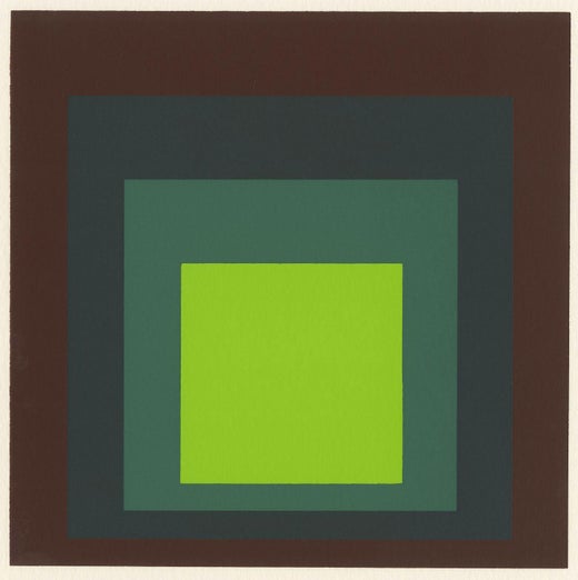Josef Albers (19 de marzo de 1888 - 25 de marzo de 1976) fue un artista y educador estadounidense de origen alemán cuya obra, tanto en Europa como en Estados Unidos, constituyó la base de los programas de educación artística moderna del siglo XX. Albers fue diseñador, fotógrafo, tipógrafo, grabador y poeta, pero se le recuerda sobre todo por su obra como pintor abstracto y teórico. He favorecía un enfoque muy disciplinado de la composición. Lo más famoso de todo son los cientos de cuadros y grabados que componen la serie Homenaje a la Plaza. En esta rigurosa serie, iniciada en 1949, Albers exploró las interacciones cromáticas con cuadrados anidados. Normalmente pintaba sobre masonita, utilizaba una espátula con colores al óleo y a menudo grababa los colores que utilizaba en el reverso de sus obras. Cada cuadro consta de tres o cuatro cuadrados de planos sólidos de color anidados unos dentro de otros, en una de cuatro disposiciones diferentes y en formatos cuadrados que van de 406×406 mm a 1,22×1,22 m Etiquetas: Bauhaus,Homenaje al cuadrado,Abstracción geométrica,Teoría del color,Arte abstracto,Modernismo,Op Art,Interacción del color,Escuela Bauhaus,Expresionismo abstracto,Estudio del color,Educación artística,Pintor abstracto,Fundación Josef Albers,Arte óptico,Cuadros,Minimalismo,Pintura de bordes duros,Forma y color,Arte y ciencia,German artist,Percepción del color,Libro La interacción del color,Variantes de color,Constelaciones estructurales,El arte de ver,Pintura de campo de color,Museo Josef Albers,Grabador modernista