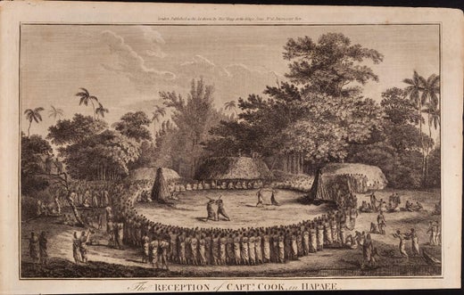 Recepción al Capitán Cook, Tonga: Grabado original del siglo XVIII, 3er Viaje de Cook