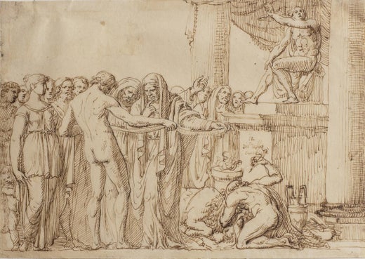 Francesco Nenci fue un pintor italiano, principalmente de temas históricos y sagrados en estilo neoclásico. Aunque su primera educación fue en Città di Castello, después se matriculó en la Academia de Bellas Artes de Florencia, donde estudió con Pietro Benvenuti. Nenci se trasladó entonces brevemente a la Academia de Brera, donde ganó premios en 1805 y 1809 por Safo y Alcaeus en Elysium y el lienzo al óleo de Zenobia encontrada junto al río Arasse, respectivamente. En 1806, ganó un premio en la Academia de Florencia por Aquiles jura vengarse de la muerte de Patroclo. Nenci obtuvo un estipendio de la administración napoleónica para estudiar en Roma, donde pintó Ajace Telamonio che vuol salvarsi dalla tempesta (1814); Il pastore che toglie il fanciullo Edipo dall' albero ove era stato appeso (1815); y Virgen en oración con putti (1816). De vuelta en Florencia, pintó una Asunción de la Virgen en la Capilla de la Villa Poggio Imperiale. Entre otras obras, se le encargó un lienzo del Martirio de Santa Irene para la iglesia de San Paolo Maggiore de Nápoles. Nenci pintó frescos de las historias de Homero en Villa Bianchi, a las afueras de Siena. Finalmente, en 1833, pintó grandes lienzos para la Sala de Ulises del Palacio Pitti. Nenci también se dedicó a realizar grabados para libros. Ilustró en grabado a mezzo macchia la edición de Dante de Ancora (Florencia, 1817). Nenci también grabó ilustraciones para una edición de la Ilíada publicada por Batelli en Florencia en 1838. Nenci enseñó en la Academia de Siena y se convirtió en director en 1827, cuando dimitió Giuseppe Collignon.