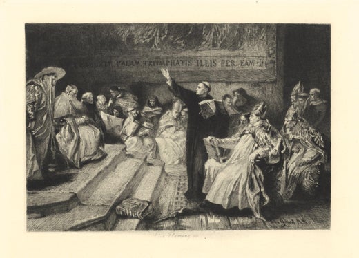 Leopold Flameng era un artista francés, conocido por sus grabados que reproducían obras de Jan van Eyck, Leonardo da Vinci, Rembrandt, Ingres y Delacroix, Boccaccio, Paul Scarron, Victor Hugo y François Coppée, produciendo cien hermosas ilustraciones. Flameng estudió primero con Luigi Calamatta y Jean Gigoux. Charles Blanc se fijó en su talento como grabador, y su colaboración en la Gazette des Beaux-Arts con su colega grabador Léon Gaucherel contribuyó a mejorar la reputación de la publicación. Flameng fue medallista en la Exposición Universal (1878) y fue elegido miembro de la Academia de Bellas Artes en 1898.
