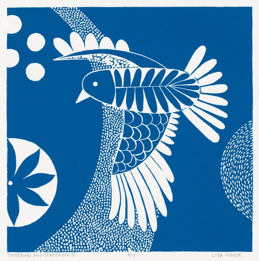 Cotorreo y parloteo I Impresión de linóleo azul/blanco de pájaro de inspiración popular
