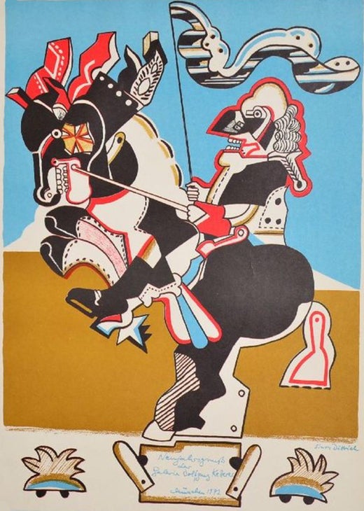 La litografía en color "Caballero sobre corcel" de Simon Dittrich, creada en 1972, recoge el enfoque abstracto del artista para retratar figuras humanas, centrándose en la fuerza y el poder. La obra está firmada y se conserva en buen estado, lo que la convierte en una valiosa adquisición para los coleccionistas de arte abstracto del siglo XX. Con unas medidas de 57,5 x 41,0 cm, la obra presenta una dinámica interacción de colores y formas, mostrando la interpretación única de Dittrich de un caballero y un caballo en orientación de retrato. Ideal para quienes buscan una litografía distintiva y firmada con temas históricos y abstractos.