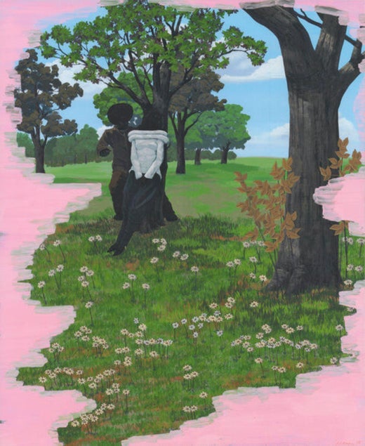 En su polifacética obra, Kerry James Marshall se esfuerza por abordar "la carencia en el banco de imágenes" elevando a las figuras negras que han sido excluidas del arte occidental. Utilizando una variedad de pigmentos negros, el artista realza los tonos de piel de sus sujetos para honrar sus identidades en lugar de ignorarlas. Más conocido por sus pinturas a gran escala, Marshall también trabaja el collage, la fotografía, el vídeo y otros medios.