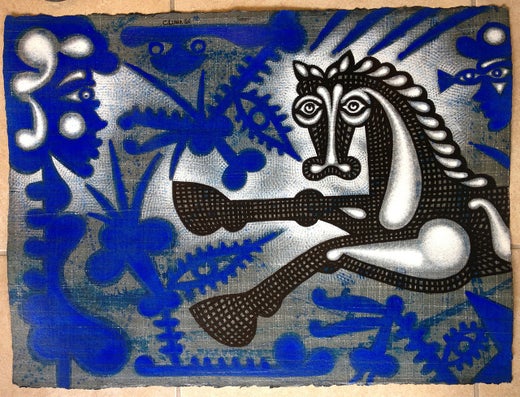 Este cuadro del artista latinoamericano Carlos Luna, realizado en técnica mixta sobre papel, representa un caballo abstracto y estilizado que vuelve a correr sobre un fondo de filigr...