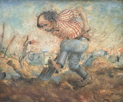 Pintura Pastoral Naturalista Figurativa de Granja de un Hombre Sembrando Semillas en un Campo