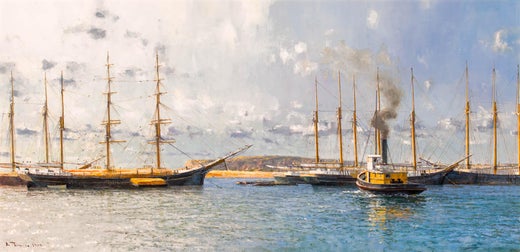 Esta luminosa y serena escena de barcos descargando frente a San Diego, California, muestra un barco con una historia poco tranquila. El cuadro muestra un día típicamente luminoso y soleado en el sur de California, con las profundas aguas azules de San Diego como telón de fondo perfecto para descargar madera crucial para la construcción. El cuadro tiene el ojo de Thimgan para el detalle, incluido el barco histórico que ha representado, seguramente con conocimiento de su historia, y su habilidad para representar tan perfectamente el paisaje costero de California y las aguas que lo rodean.