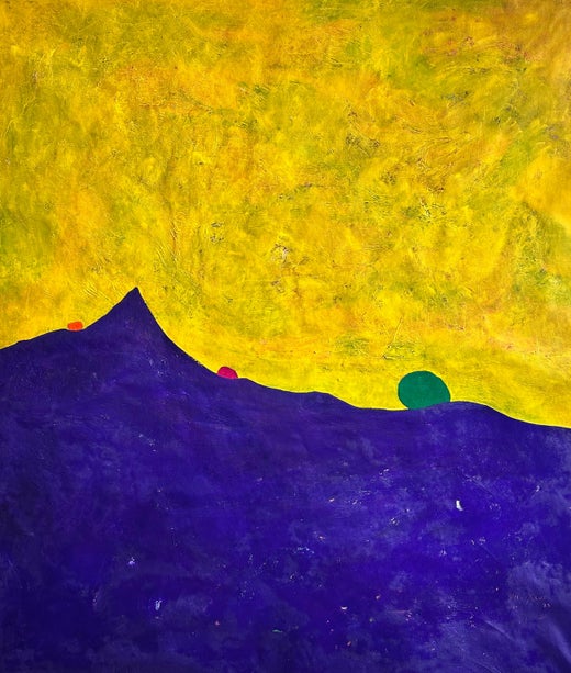 Este cuadro abstracto explora la relación entre el color, la forma y el espacio mediante el uso de dos campos dominantes: una forma azul violeta intenso que sugiere un contorno monta...