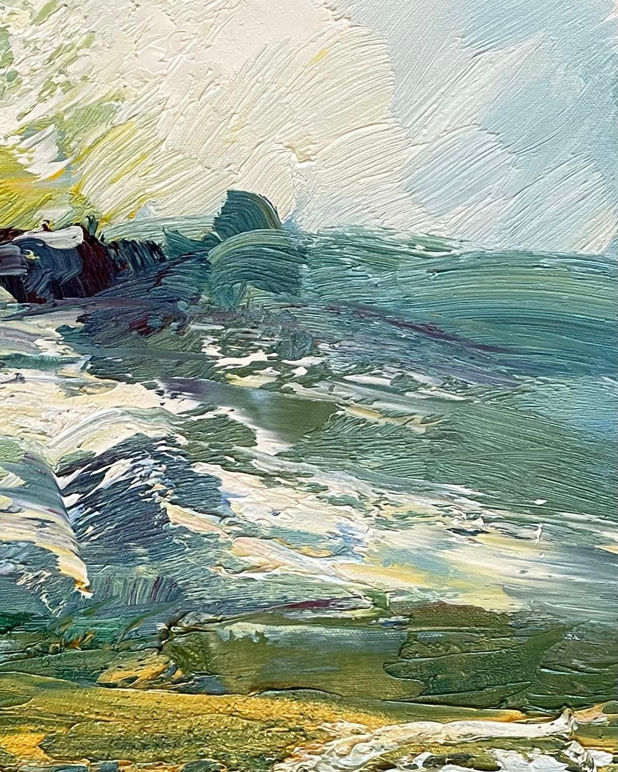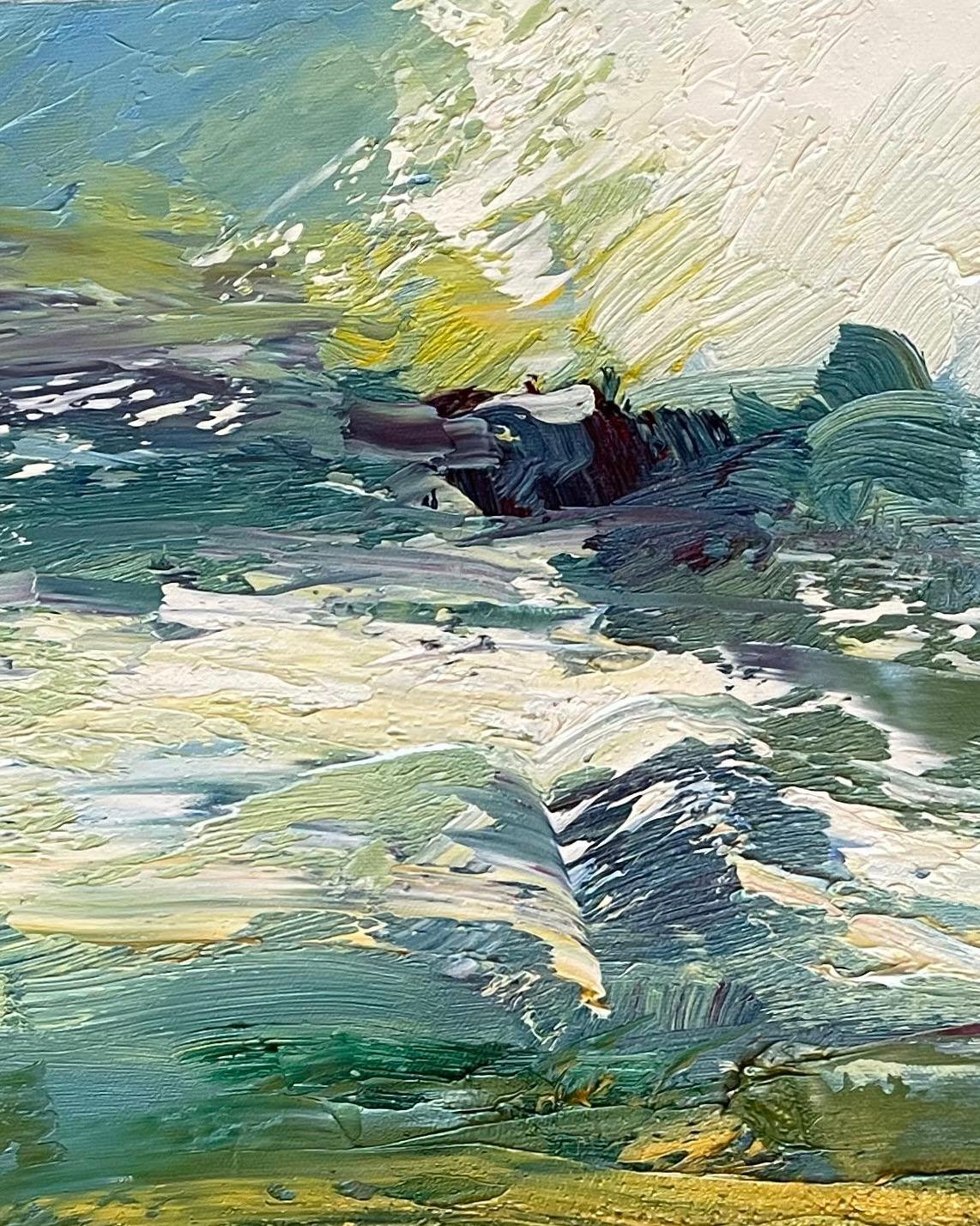 "Ascenso" de Masri es un paisaje abstracto en técnica mixta de 20" x 16" que capta la energía dinámica del mar. Esta obra de arte entrelaza magistralmente una miríada de colores, con una paleta dominada por diversos tonos de verde, blanco y un toque de amarillo y marrón. La rica y espesa aplicación de pintura forma ondas texturadas, creando una sensación casi palpable de movimiento y turbulencia. Las crestas blancas de las olas, en contraste con los profundos tonos esmeralda y verde azulado, evocan la luz del sol reflejándose en la superficie del agua. El estilo abstracto de Masri, caracterizado por pinceladas audaces y una superficie texturizada, transmite con éxito el poder crudo y desenfrenado del océano. Esta pieza ofrece al espectador una experiencia sensorial, transportándole a una costa donde el ritmo de las olas dicta la danza de los colores.