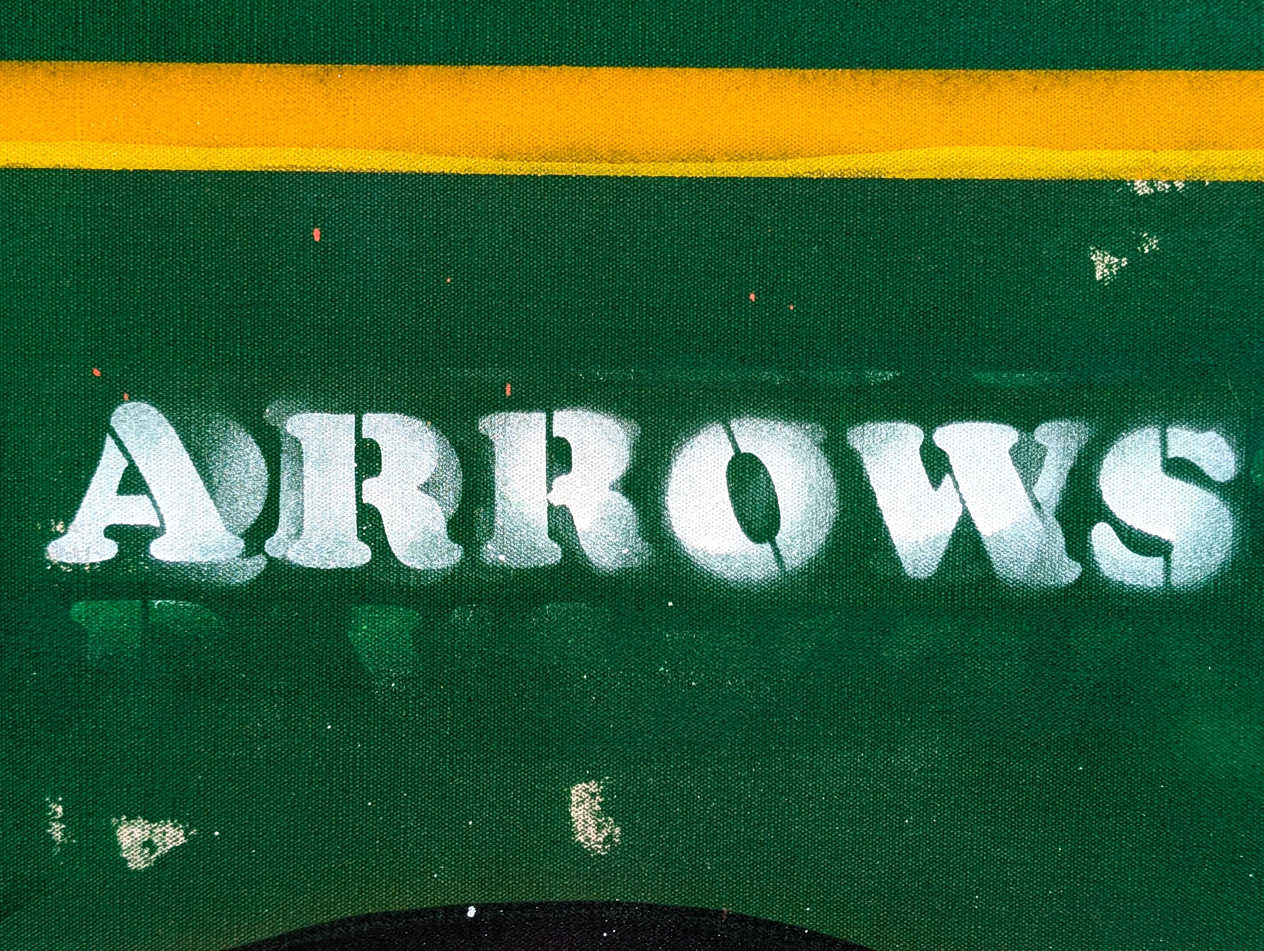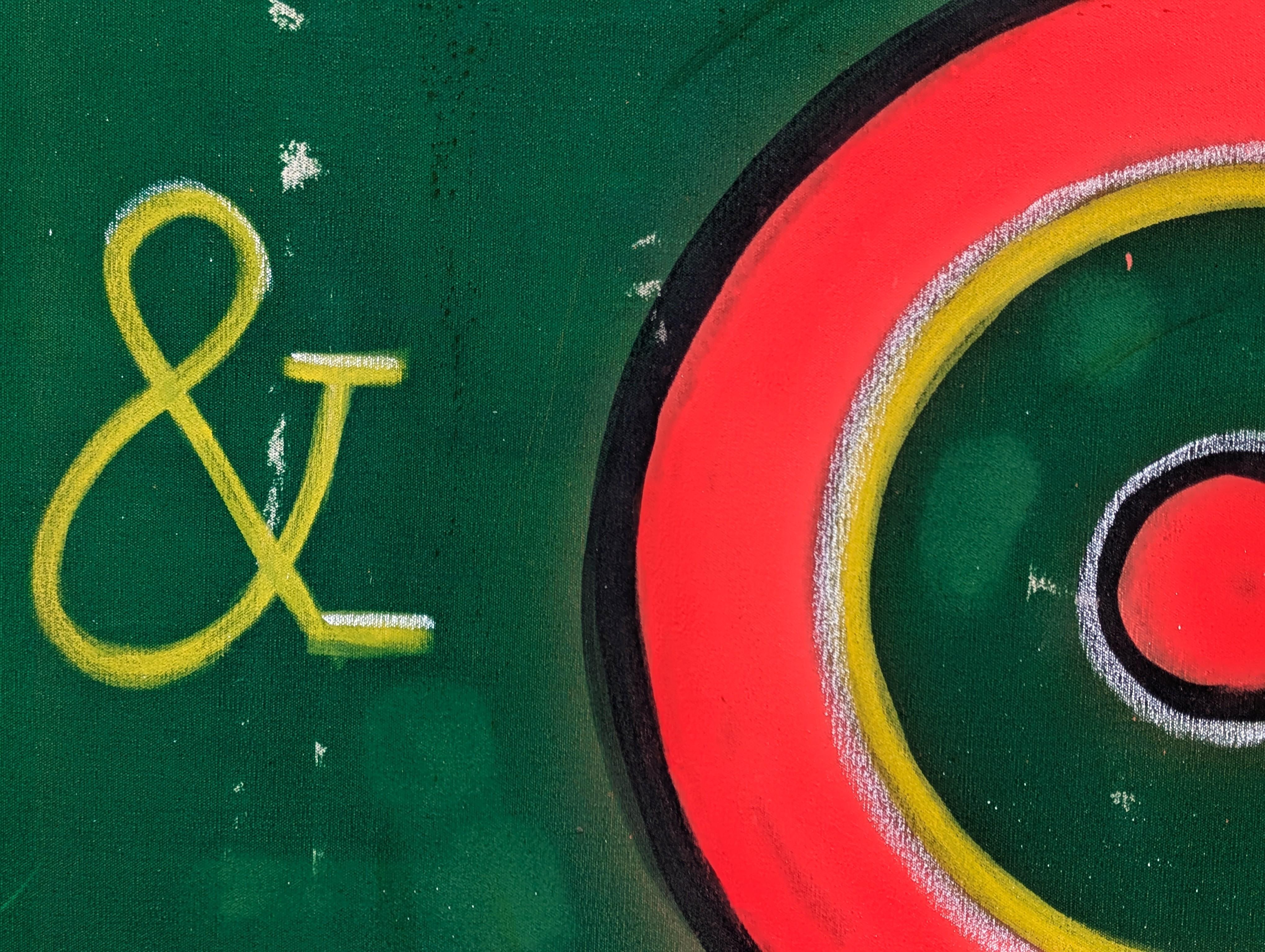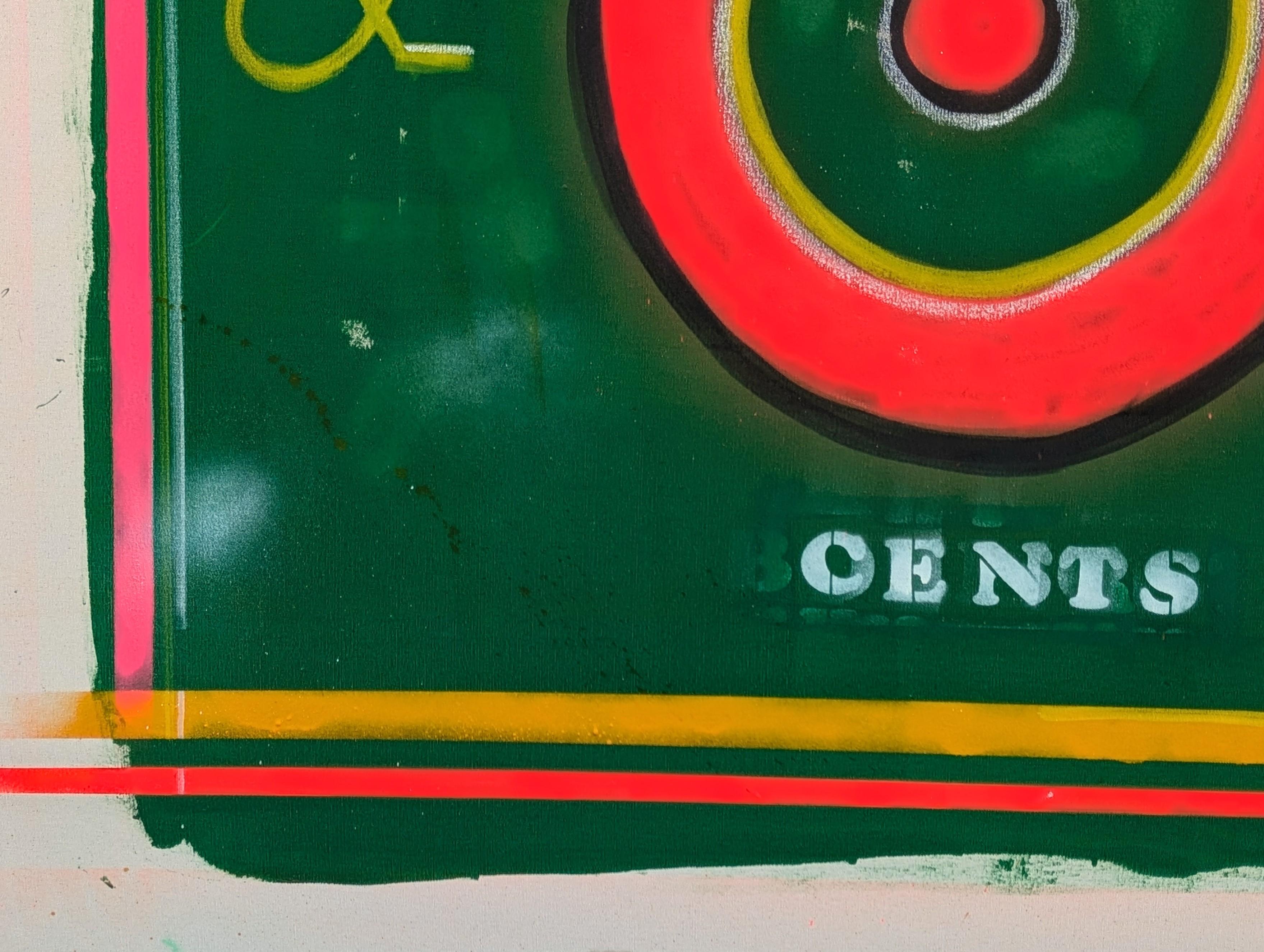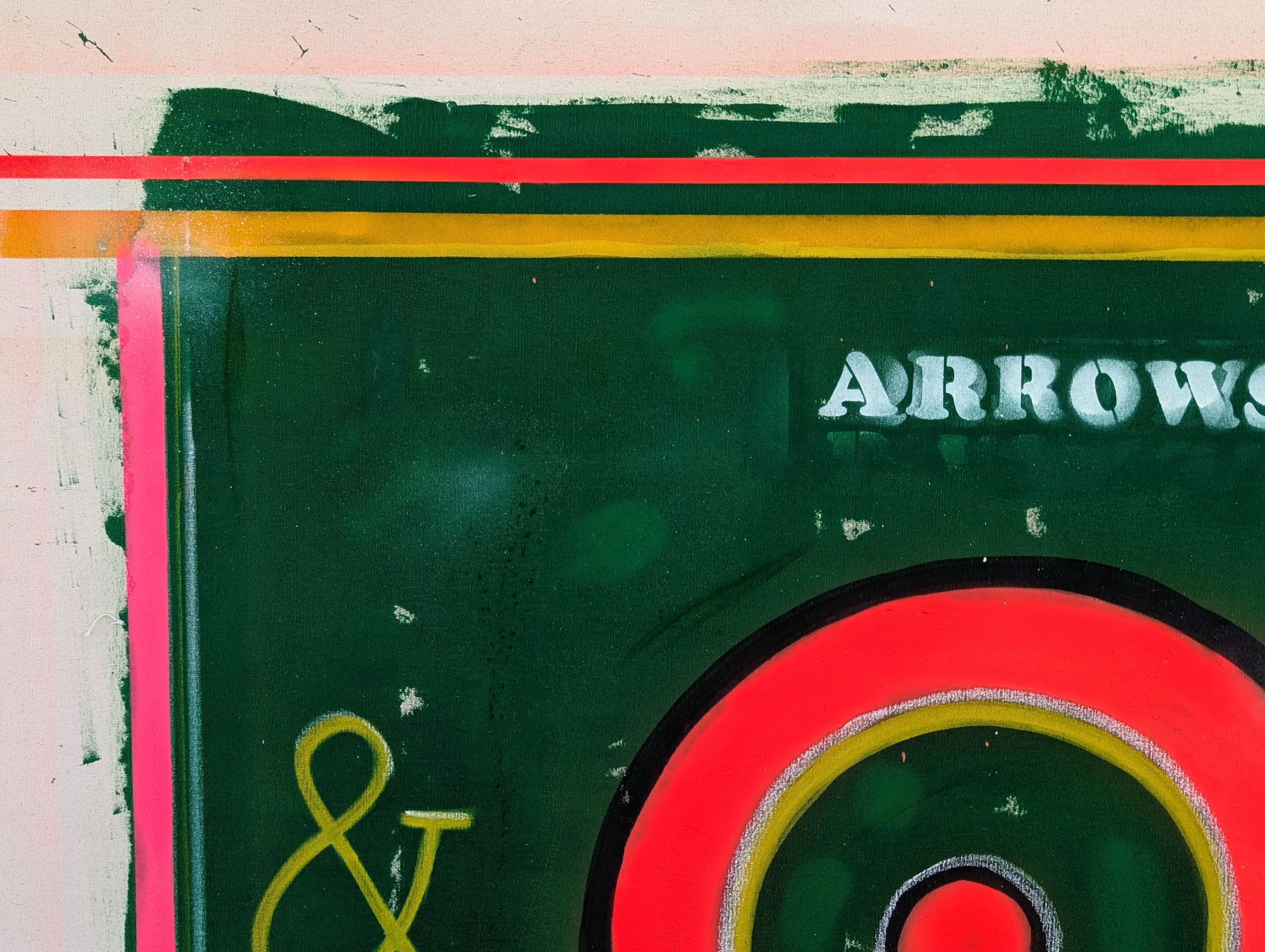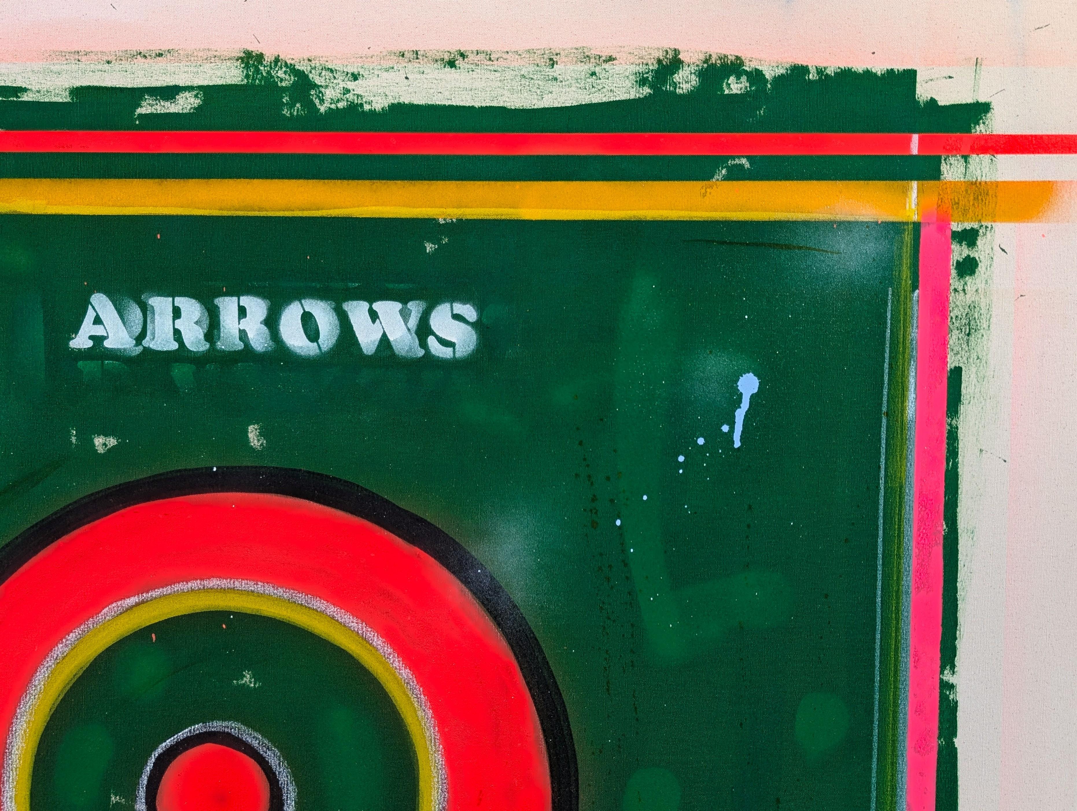 Pintura contemporánea en blanco de colores del artista Nick Stevenson, afincado en Texas. La obra presenta una diana central de neón rojo, verde y amarillo flanqueada por el texto "Arrows