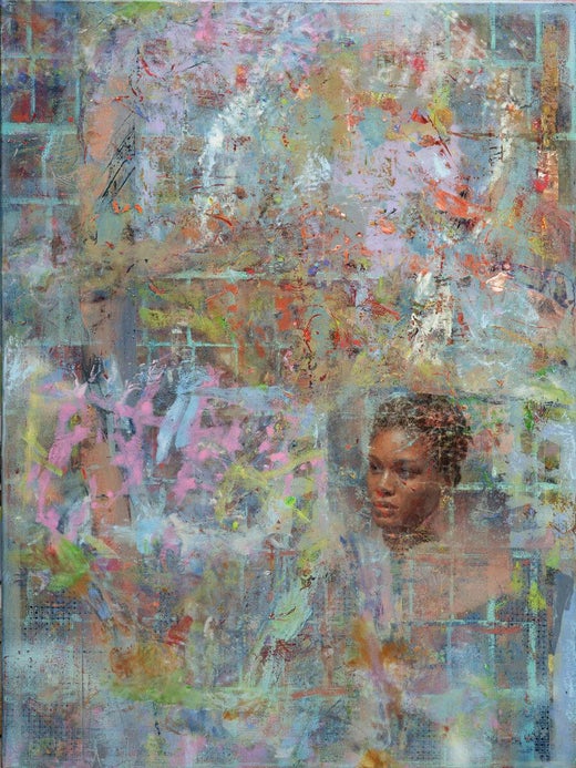 "Pregúntale a Alice" representa un retrato realista de una mujer dentro de un óleo abstracto.