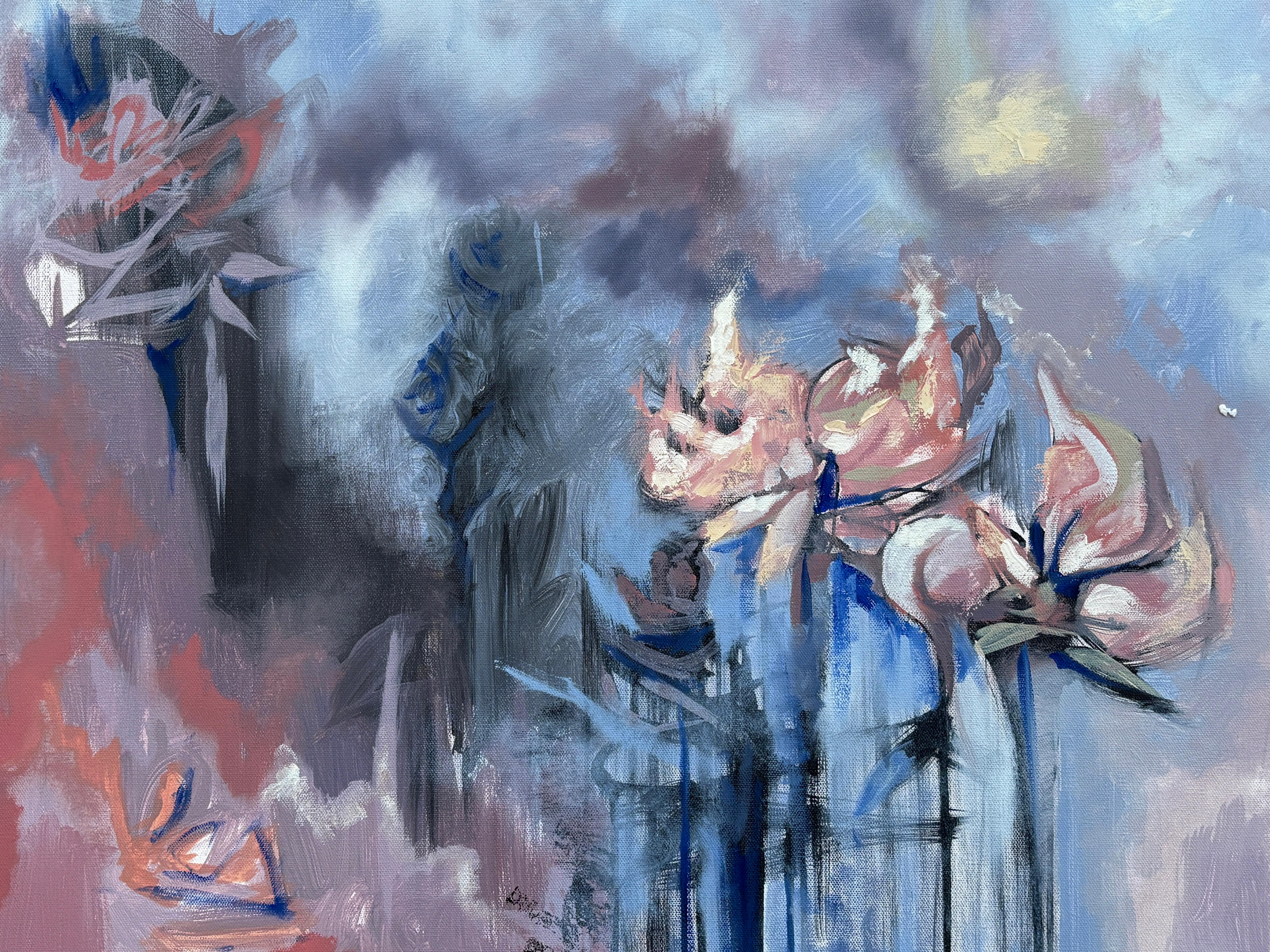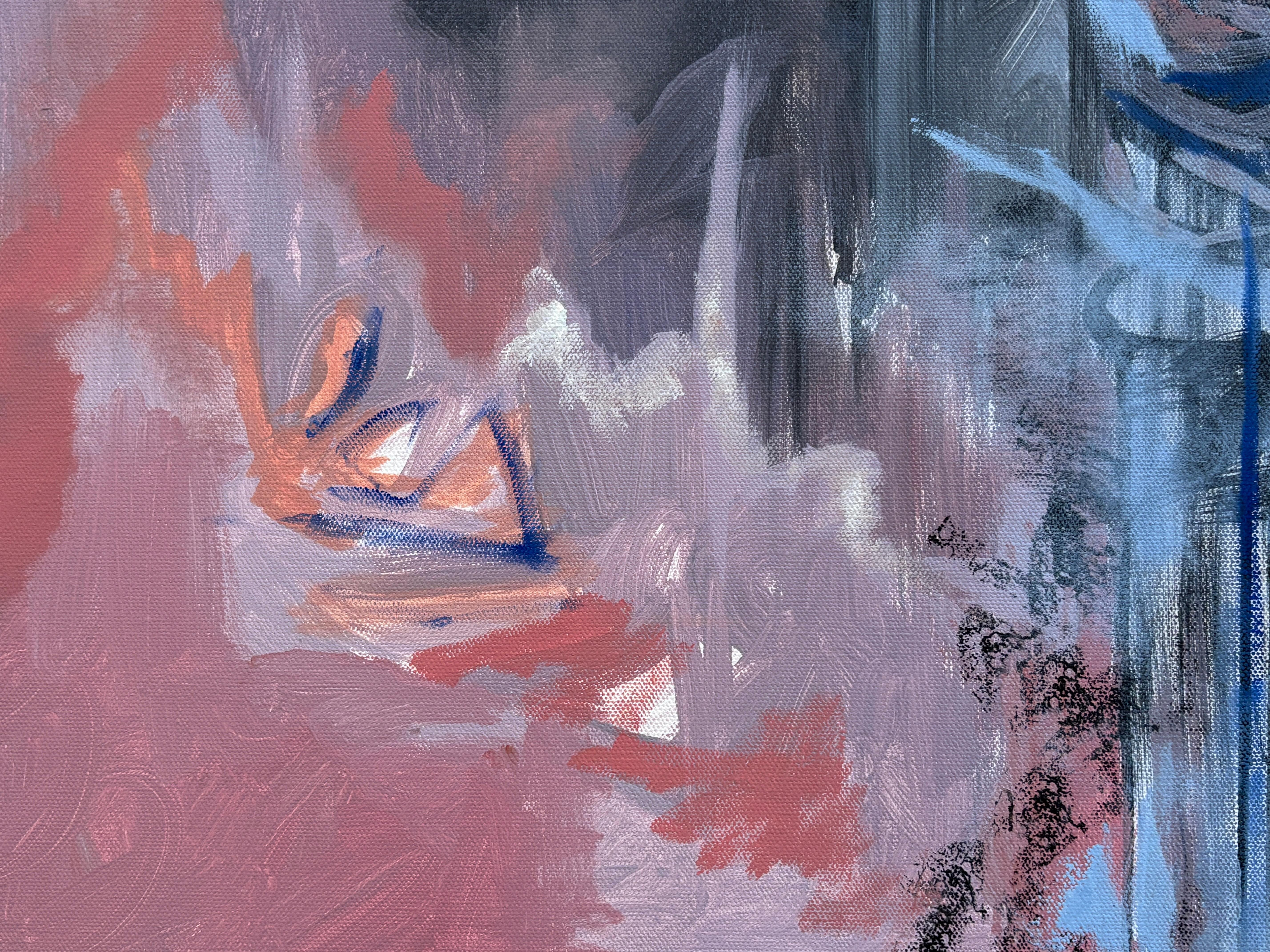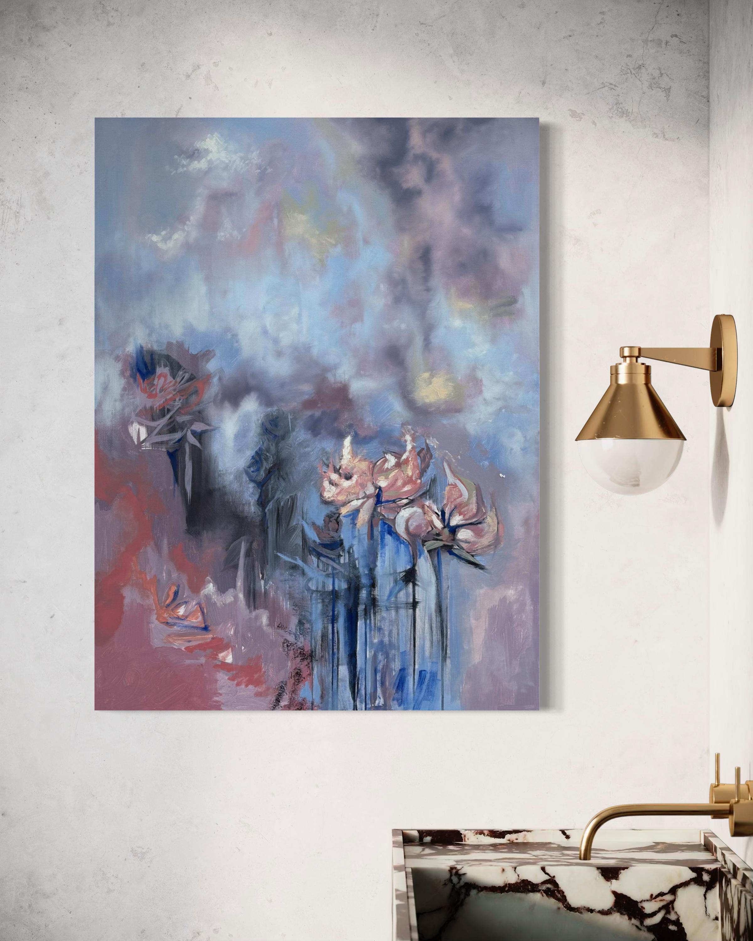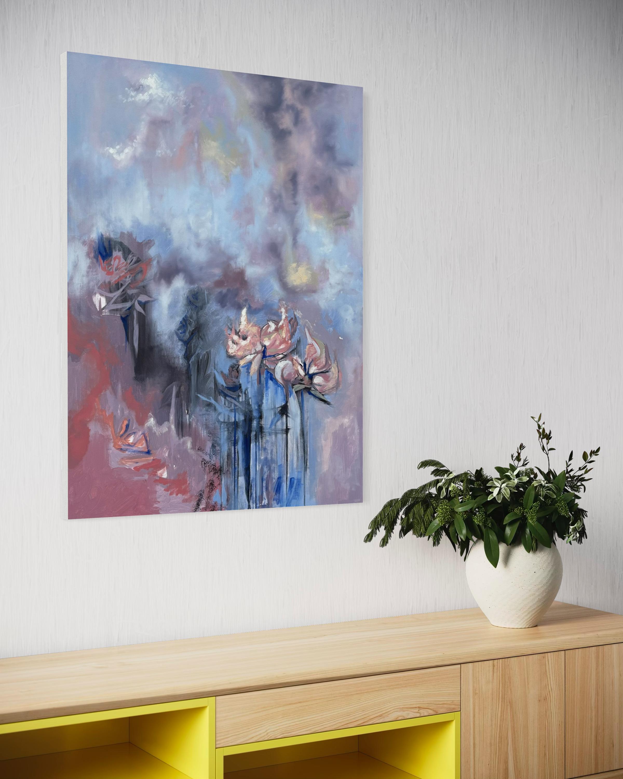 "Premoniciones" Un gran óleo evocador con azules, rosas y lavanda