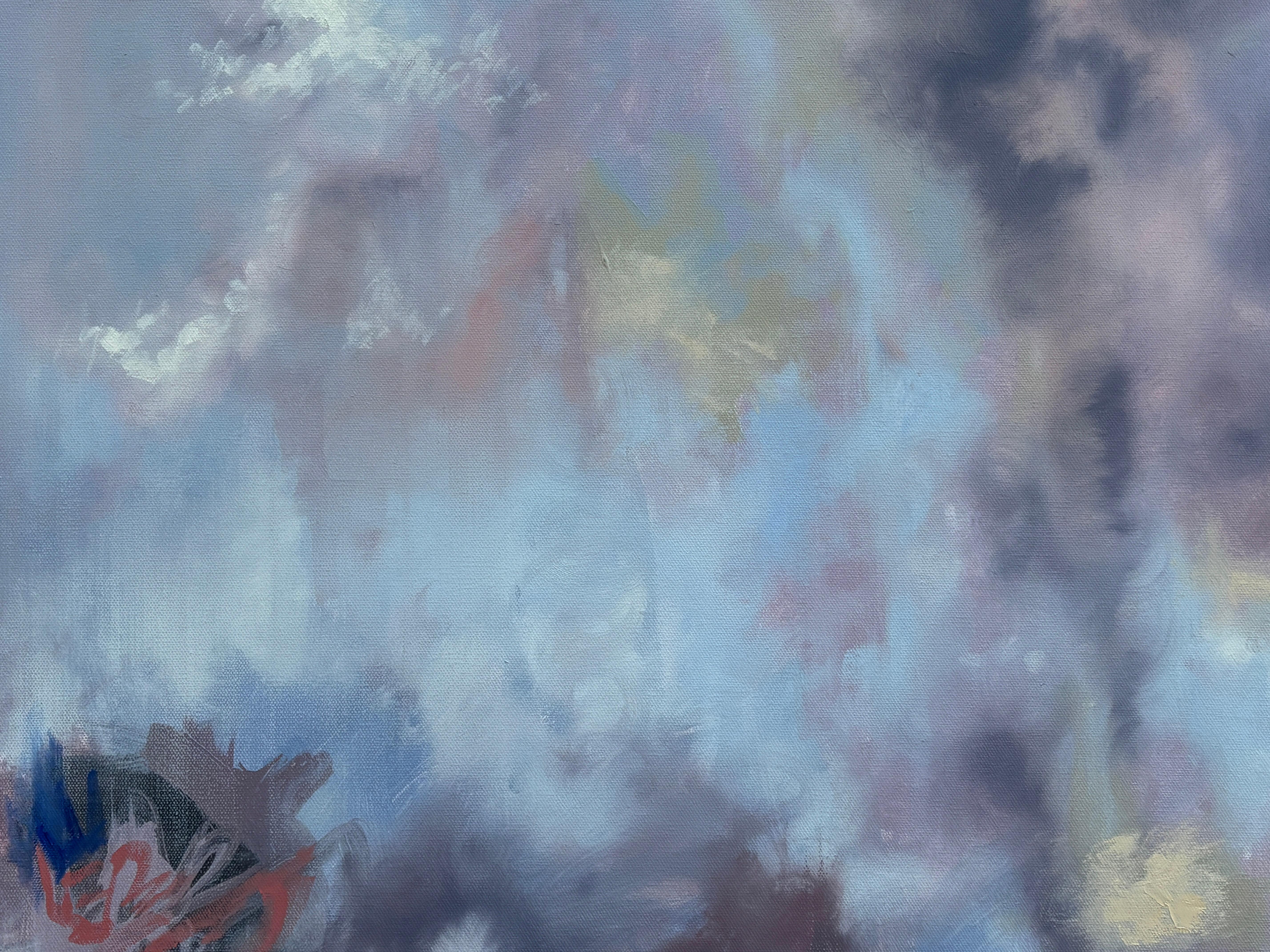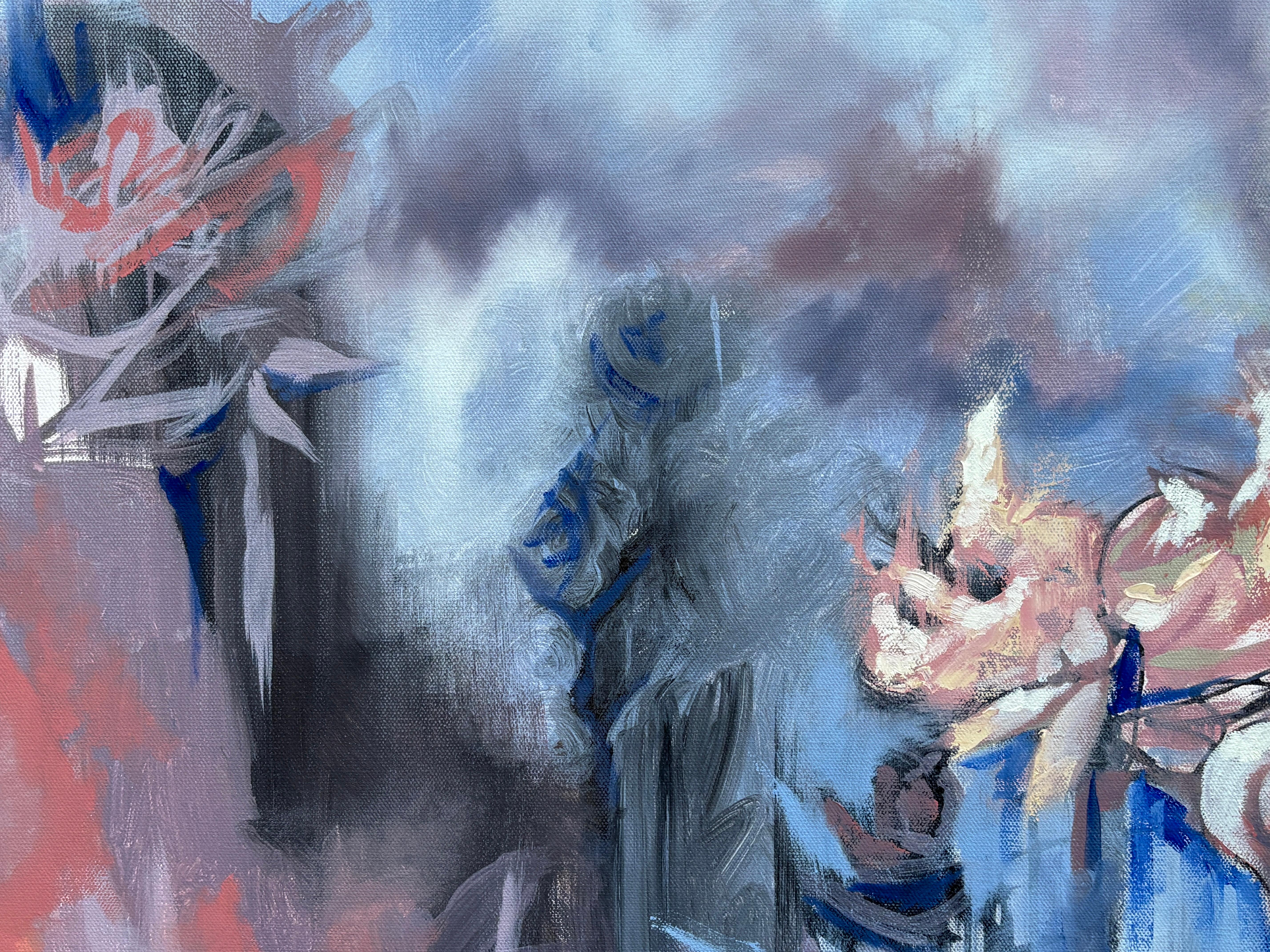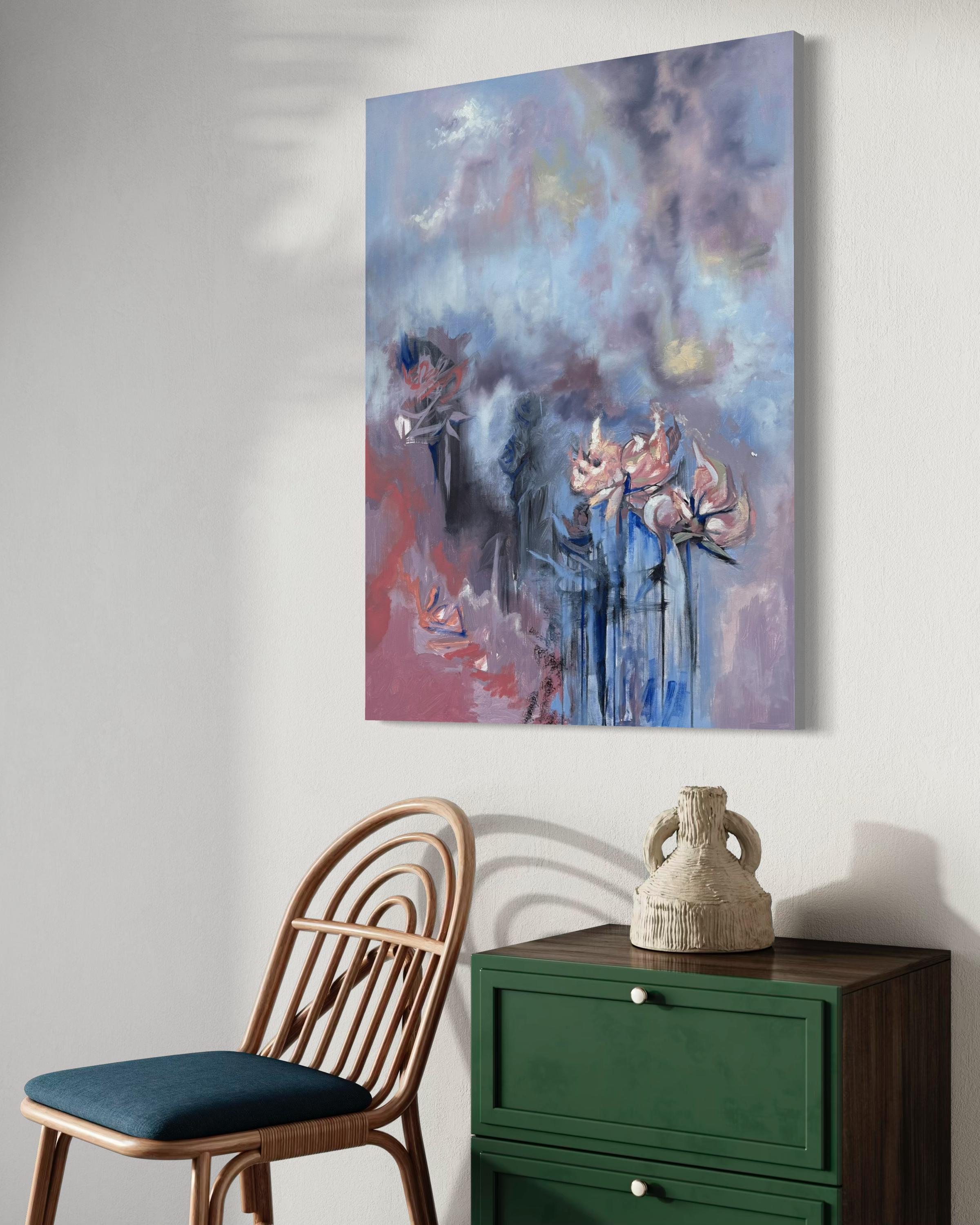 "Premoniciones" Un gran óleo evocador con azules, rosas y lavanda