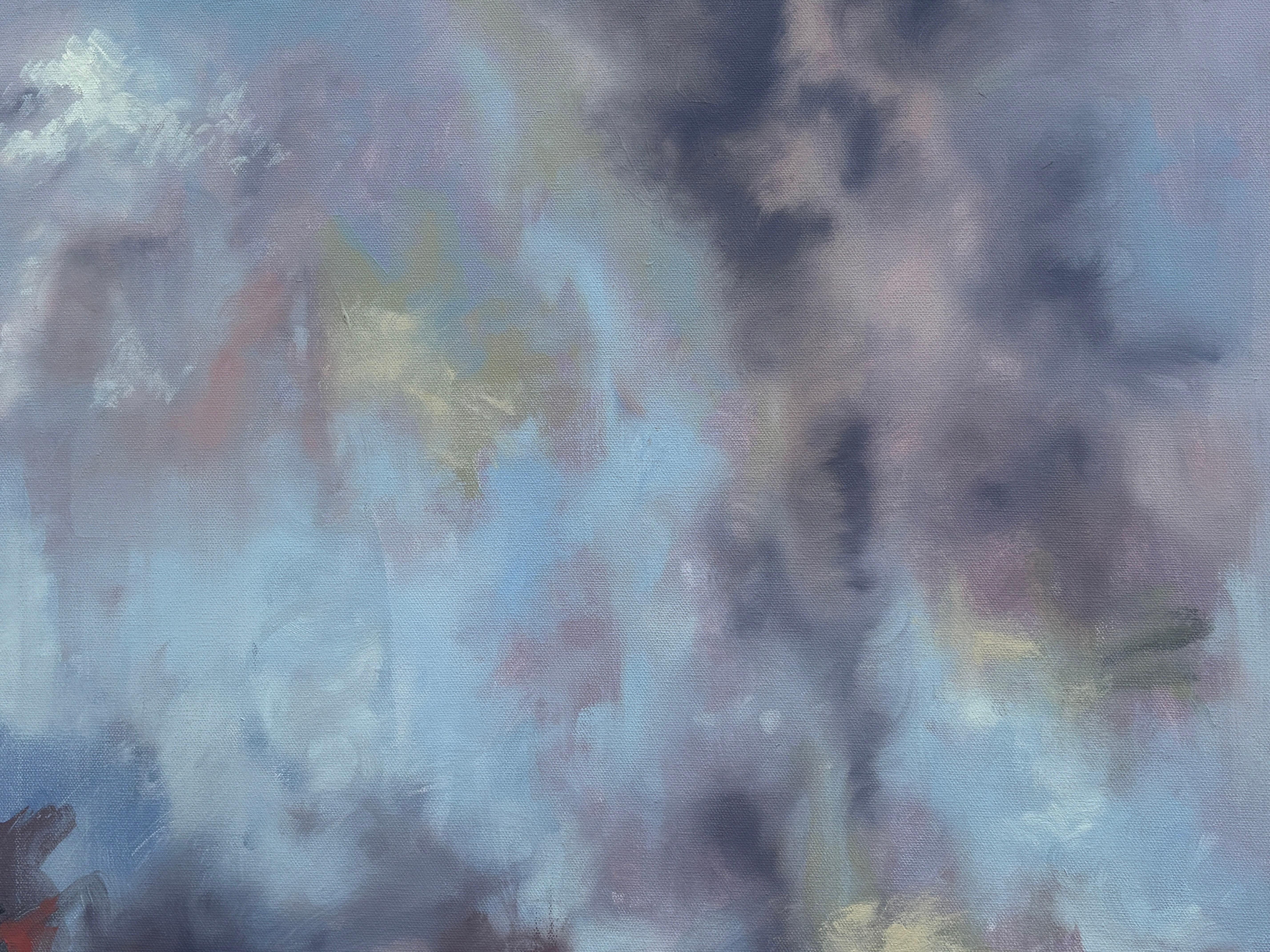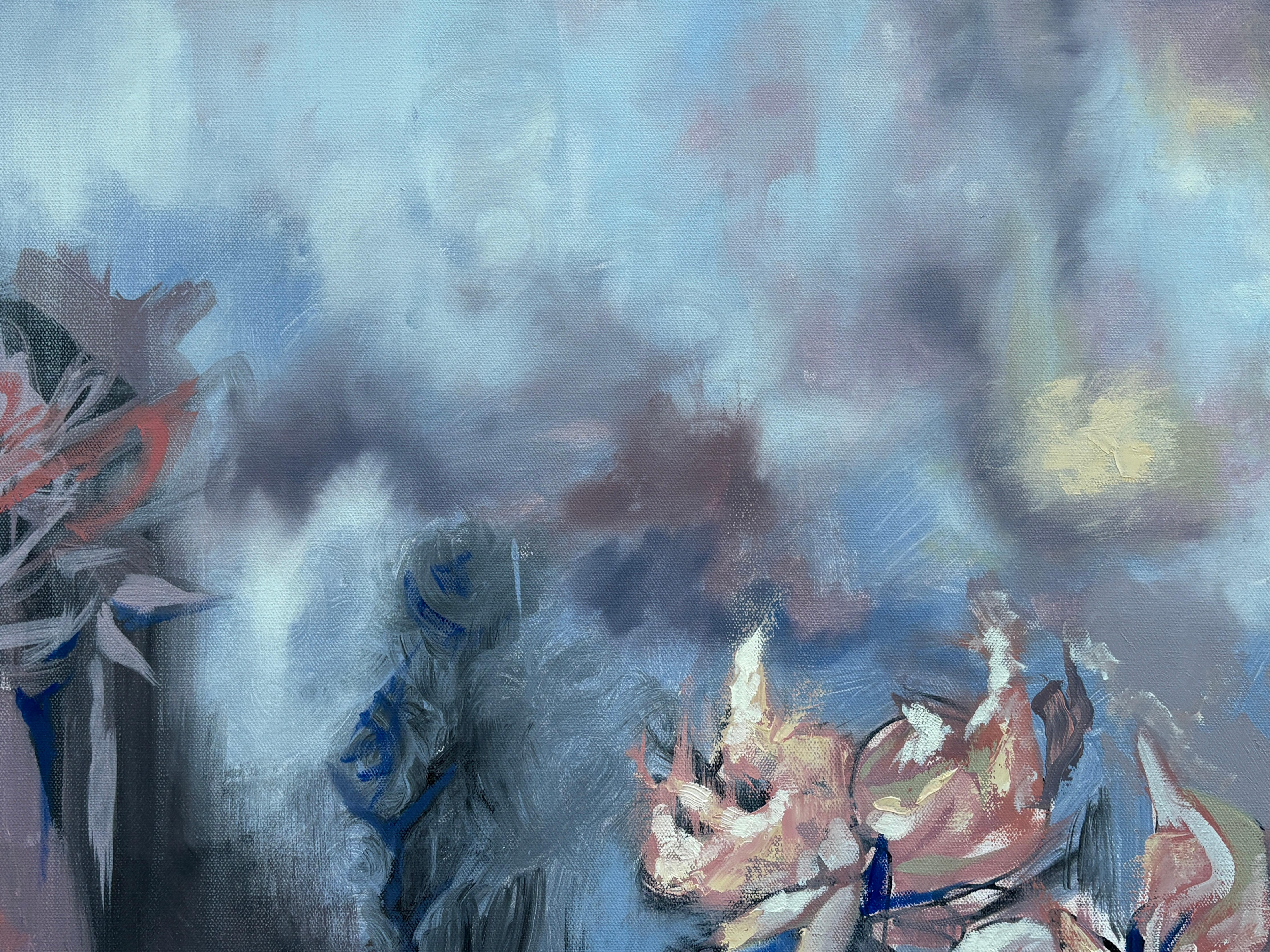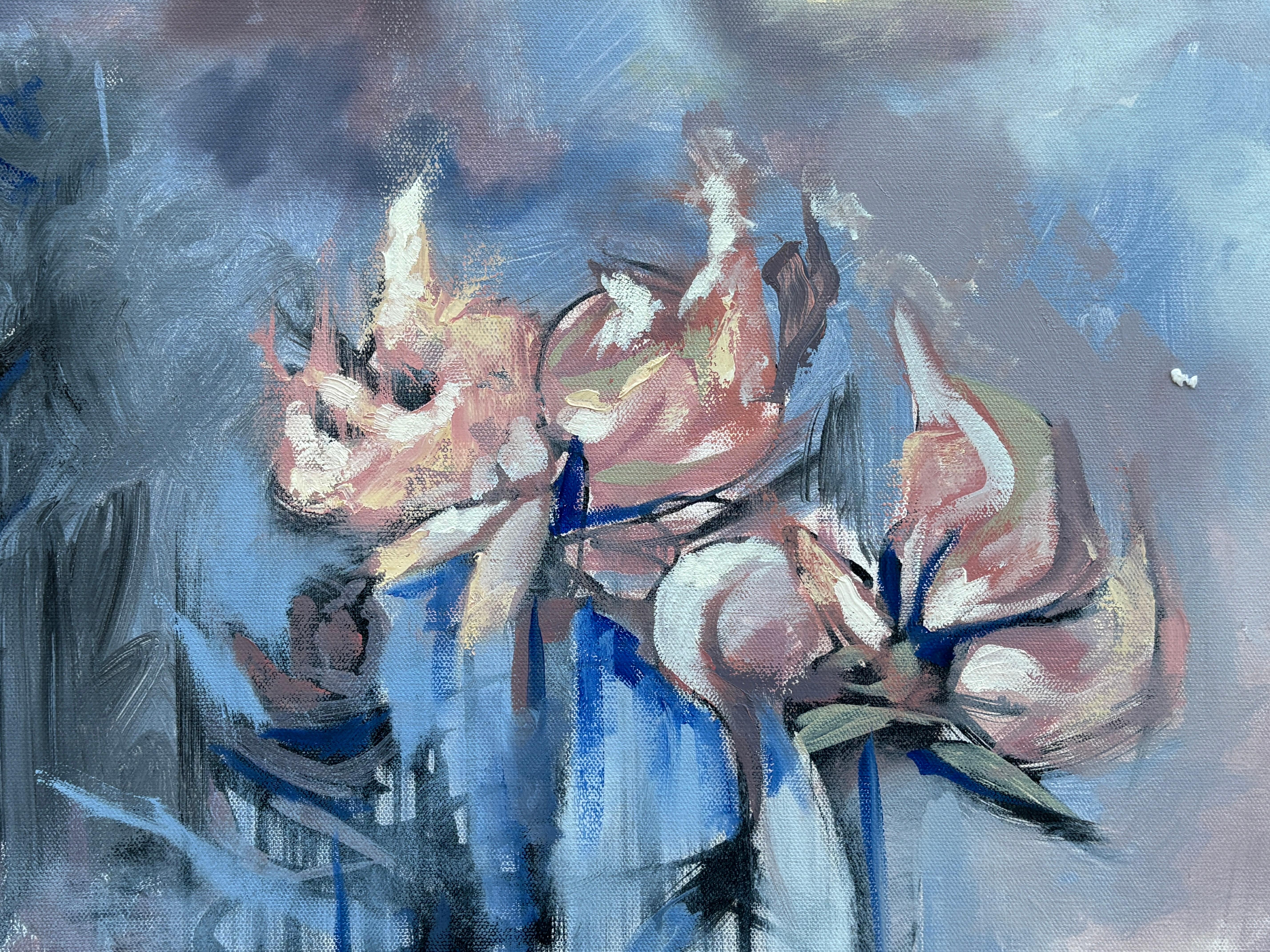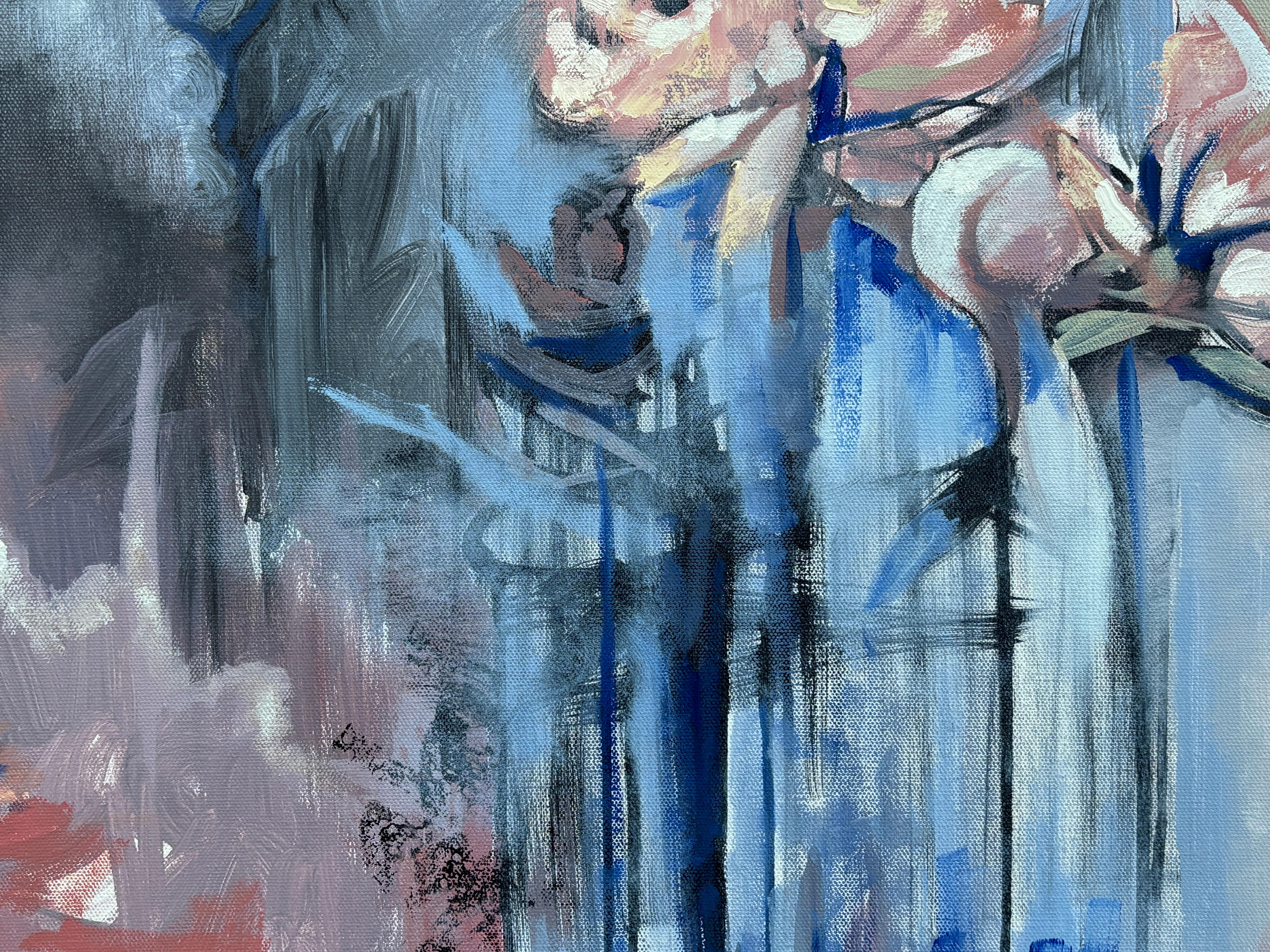 "Premoniciones" Un gran óleo evocador con azules, rosas y lavanda