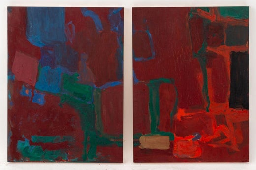 Robert O'Meara (estadounidense, XX-XXI), Dos composiciones abstractas, Óleo sobre lienzo sin estirar, con fondo azul, ambas sin firmar, sin enmarcar. Mayor: 22,75" Al x 18,75" An. Pr...