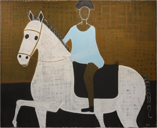 Este gran óleo figurativo es una reinterpretación de dos cuadros de John Vanderbank, Un joven caballero montando un caballo domado, 1729 / Hombre a caballo, 1728. Una pintura al óleo...