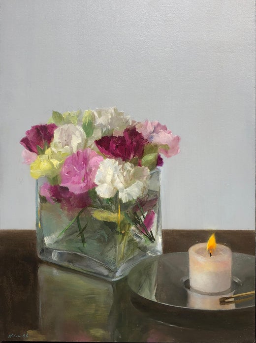 Helen OhBodegón con vela -Florero de cristal con flores rosas y blancas y vela encendida2018