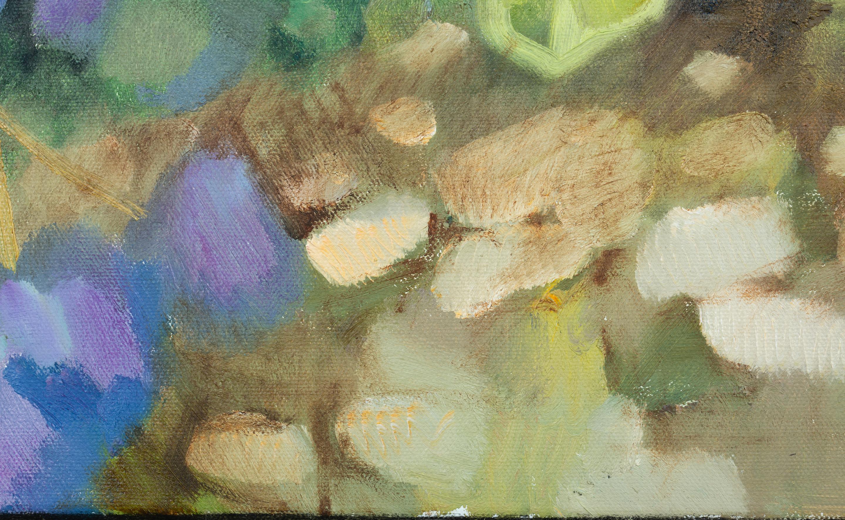 "Purple Luxury" is a vibrant and expressive work of art that immerses the viewer in a world of refined beauty and luxury. The painting depicts a lush bush of purple flowers that the artist encountered in one of the California parks. The bush seems to float in the air, surrounded by bright shades of green and sunlight. Each petal inflorescence blooms into a storm of rich purple shades, harmoniously complemented by splashes of orange and red accents.