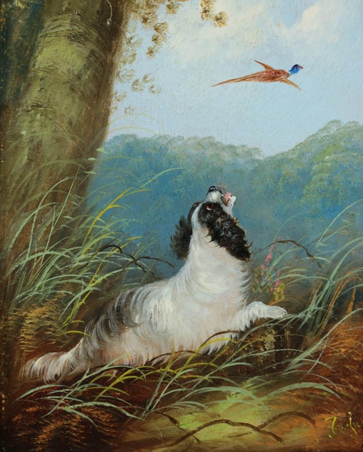 Paisaje al óleo victoriano del siglo XIX de un perro spaniel cazando un faisán en un bosque. Un óleo típico del artista deportivo del siglo XIX Jean Langlois. A menudo se dice, de forma inexacta, que vivió y trabajó de 1855 a 1904, pero esto se ha refutado en gran medida. Se cree que en realidad es el famoso artista Edgar Armfield (1857-1935), hijo de George Armfield, también célebre artista deportivo.