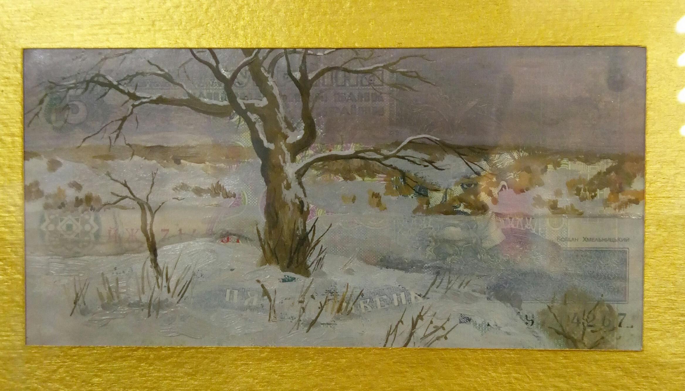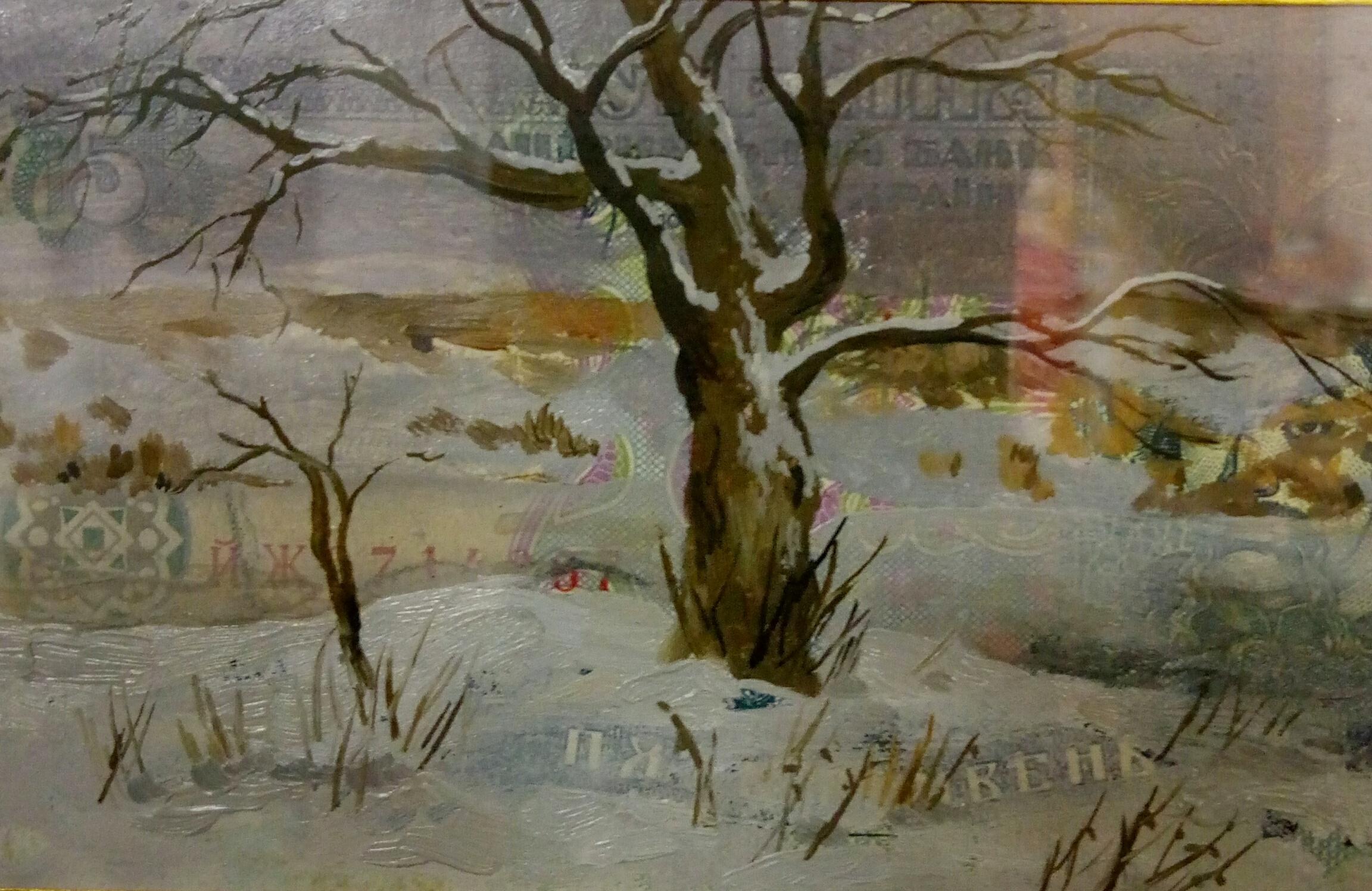 Invierno, paisaje invernal, río, Dniéper, Ucrania, hryvnia ucraniano, dinero, arte ucraniano, paisaje ucraniano, pintura sobre dinero.
