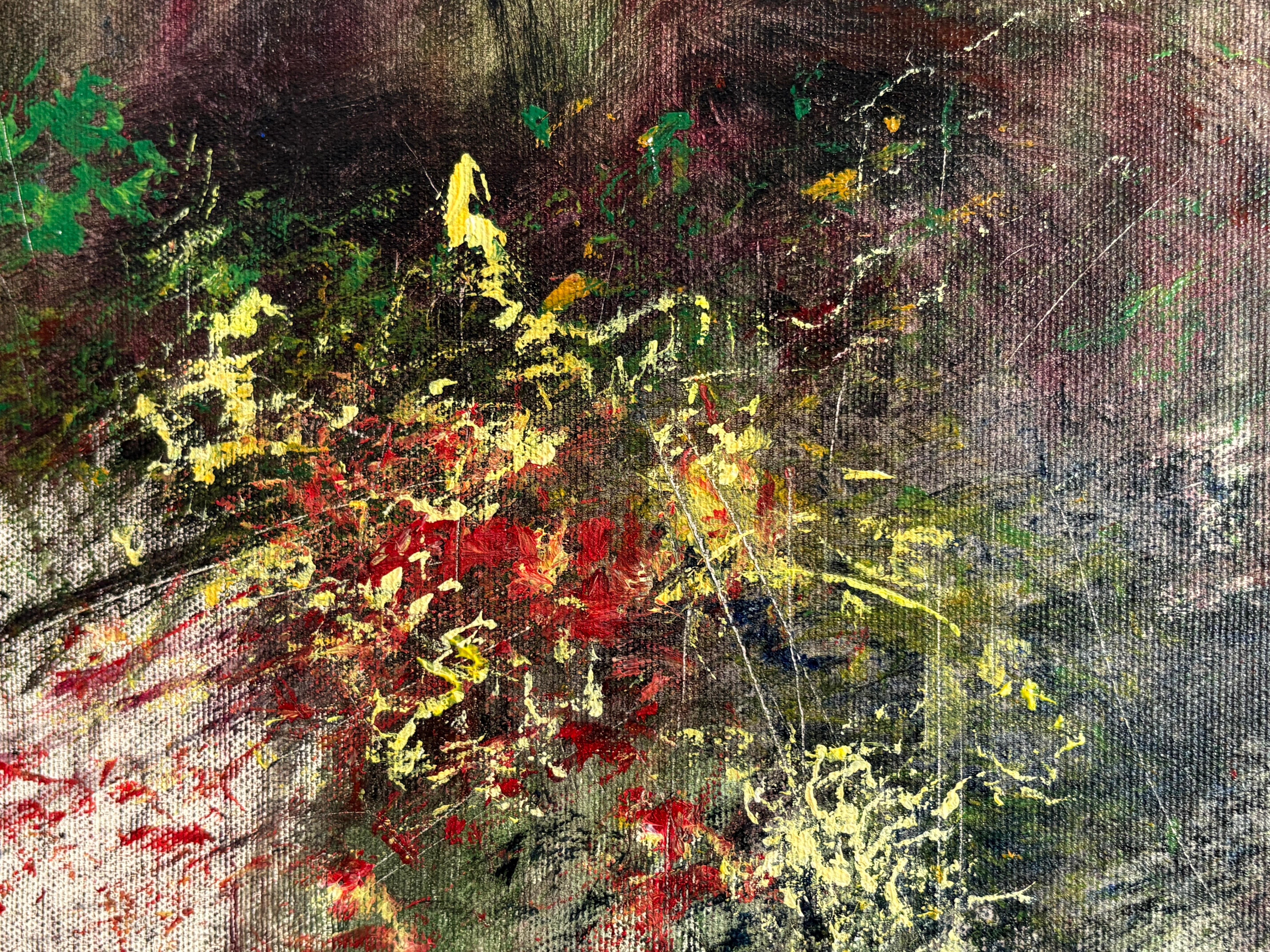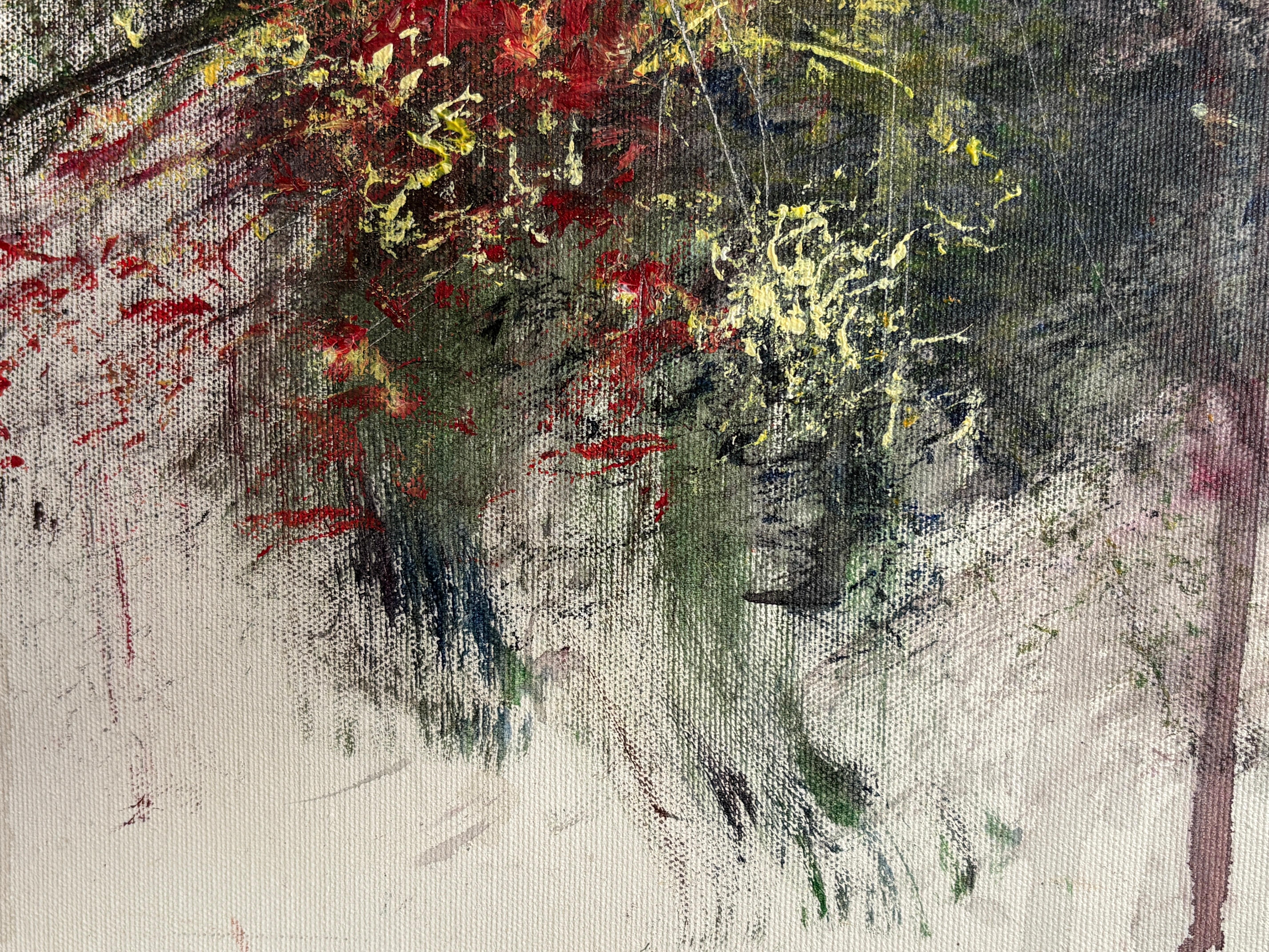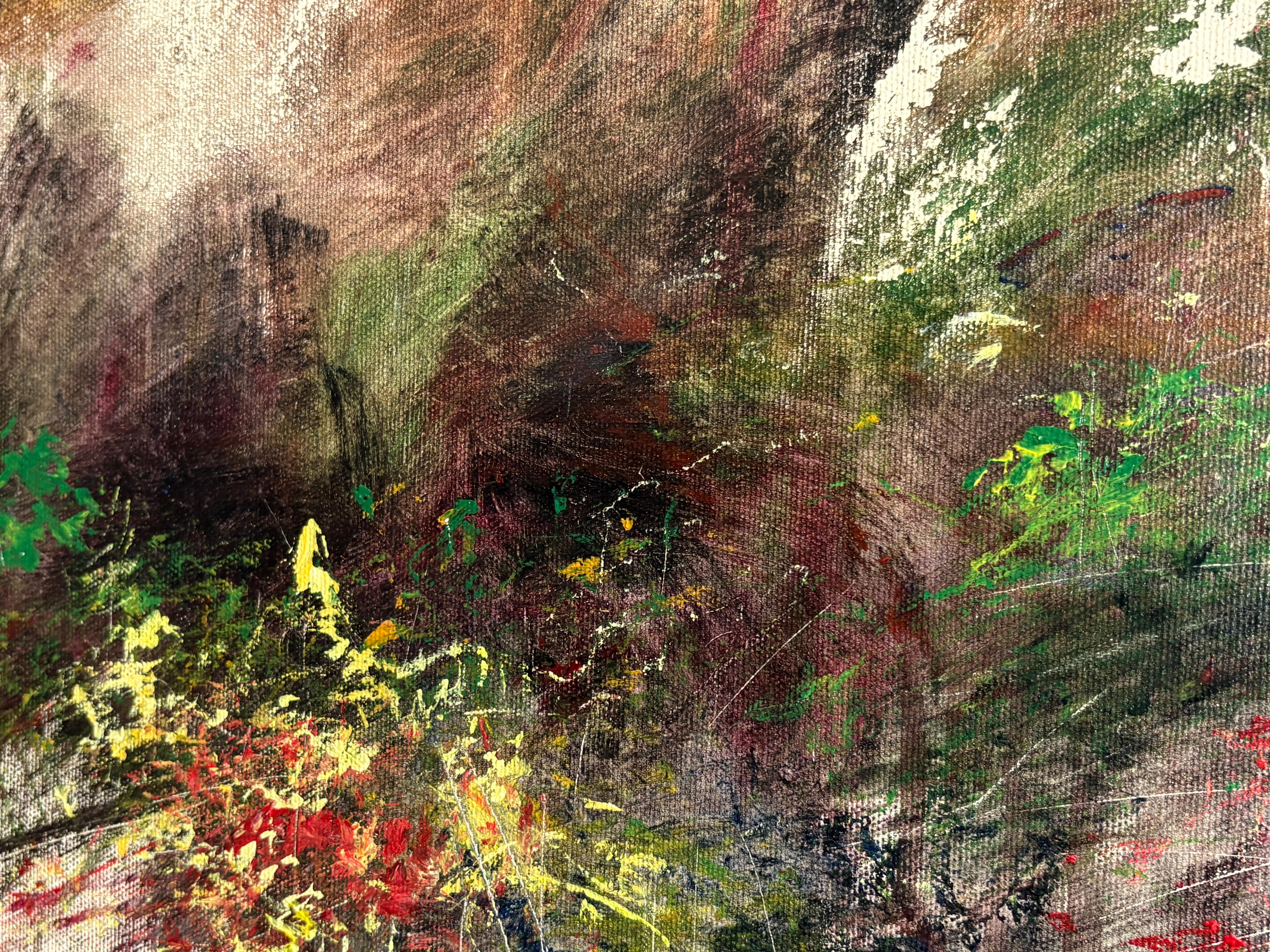 Este óleo sobre lienzo de 28" x 20" de Masri representa un paisaje abstracto que juega con la textura y el color para evocar la esencia de una escena natural. El cuadro presenta una ...