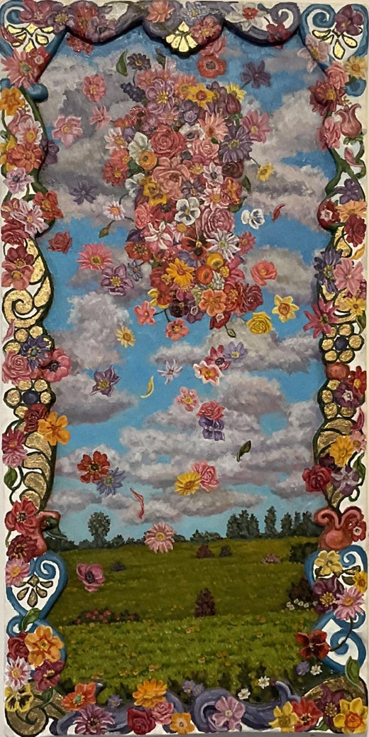 Las atrevidas flores y los motivos geométricos repetitivos de esta serie de cuadros están exuberantemente modelados en pintura al óleo, y se combinan con el uso de incrustaciones de madera. Alrededor de los coloridos y caprichosos ramos y guirnaldas hay una cenefa de colores complementarios plagada de imágenes florales caleidoscópicas para atraer aún más la mirada. Predominan las influencias de las miniaturas persas y del barroco francés, así como la pintura floral tradicional que se utilizaba para documentar la belleza de la naturaleza. La artista afirma: "Al utilizar temas históricamente decorativos y pictóricos, intento explorar el contenido más etéreo del medio". Los cuadros se vuelven visualmente intensos y alucinantes a medida que las distintas variedades de flores y hojas danzan y se entrelazan en la geometría de los motivos circundantes.