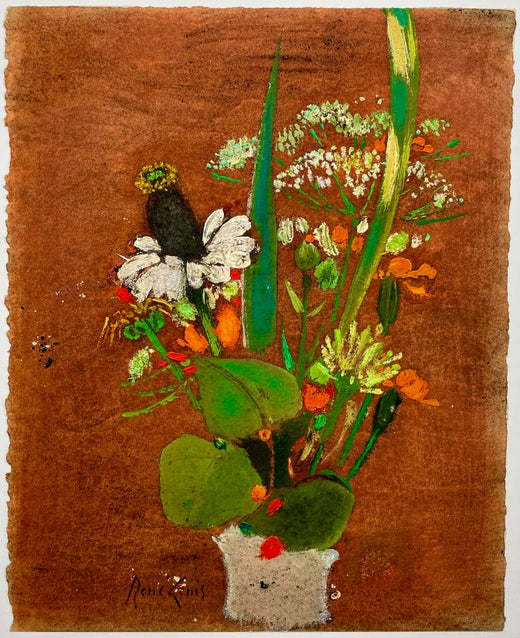 Rene Genis (francés 1922-2004) Naturaleza muerta. Principalmente naranjas y marrones, frutas y flores, sobre un fondo de marrones con un cántaro central. Los marrones contienen una...