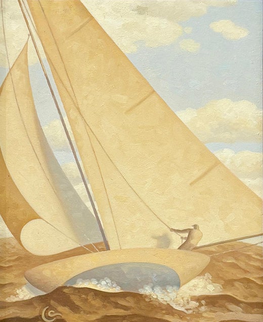 Robert GoldstromVela dorada 12, Estudio (Pintura al óleo en tono sepia de velero y figura)2025