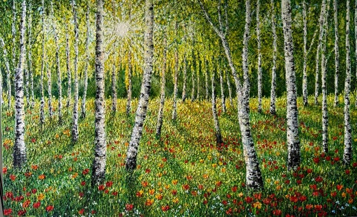 La artista contemporánea Sophia Chalklen vende en línea y en nuestra galería de Wychwood Art. Sophia siempre ha sentido una gran pasión por el arte desde que era una niña. Sophia estudió en la escuela de arte de Winchester, donde se licenció en diseño textil. Tras licenciarse, pasó a trabajar como diseñadora autónoma de textiles estampados para una pequeña empresa de Londres. Poco después consiguió un trabajo como diseñadora de alta joyería para los joyeros de la Corona, Asprey y Garrard Bond St. Sophia se especializó en el diseño de joyas de alta gama, accesorios y ornamentos para la realeza inglesa y de Oriente Medio y para la élite. También diseñó una gran variedad de artículos, como anillos, suites de joyería, relojes, gemelos, relojes con incrustaciones de joyas, tiaras y adornos preciosos. Su ojo para el detalle se prestó bien a su carrera en el diseño de joyas y se convirtió en una experta en su campo. Una vez que decidió formar una familia, volvió a centrarse en su amor por las bellas artes, el dibujo y la pintura, y montó su propio negocio impartiendo clases de arte para grupos de todas las edades. Imparte clases semanales a niños de 5 a 11 años, así como clases particulares en grupo para adolescentes y adultos. También dio clases semanales, en residencias de ancianos, que fueron realmente gratificantes y beneficiosas para la salud mental de los residentes. Debido a la pandemia de Covid sus clases quedaron en suspenso. Durante este tiempo, se puso bastante enferma y fue incapaz de caminar durante unos 6 meses. Echaba muchísimo de menos sus paseos por la naturaleza y para ayudarla mentalmente a sobrellevar la situación decidió pintar, y empezó a crear su propia obra como artista. El trabajo de Sophia despegó y desde entonces está muy ocupada con encargos regulares. Se inspira en la naturaleza y la luz, y le gusta añadir a su arte pan de oro de 24 quilates, lo que le da un toque de magia. Ahora ha empezado a vender una nueva línea de pinturas al óleo edificantes, únicas e inspiradas en la naturaleza. Al igual que el arte, la naturaleza es una forma asombrosa de terapia y escapismo. Cuando combinó las dos cosas se sintió realmente feliz. Sophia también disfruta pintando animales salvajes y un porcentaje de las ventas se destina a la conservación de la fauna salvaje. Para ella, lo mejor de vender obras de arte es ver la alegría que proporcionan a los demás, especialmente cuando el tema tiene mucho significado. Sophia cree que tiene suerte, ya que un artista a menudo ve lo que otros sólo pueden vislumbrar.....
