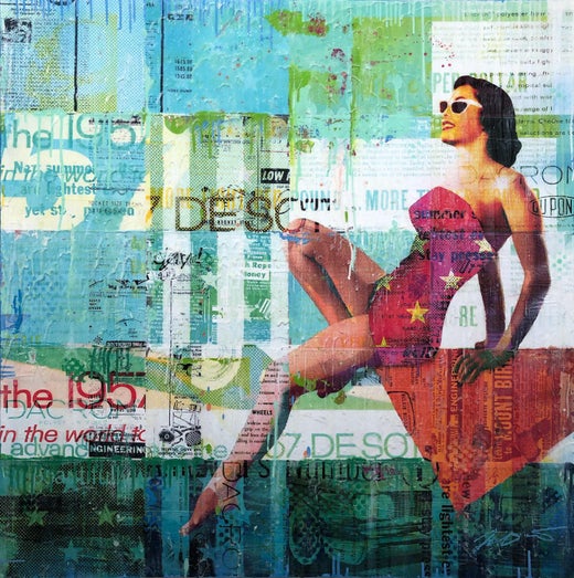 Esta pieza representa un colorido retrato en composición de collage de una modelo Pin-up de los años 50, mientras Jon Davenport explora el proceso de deconstrucción de imágenes icóni...