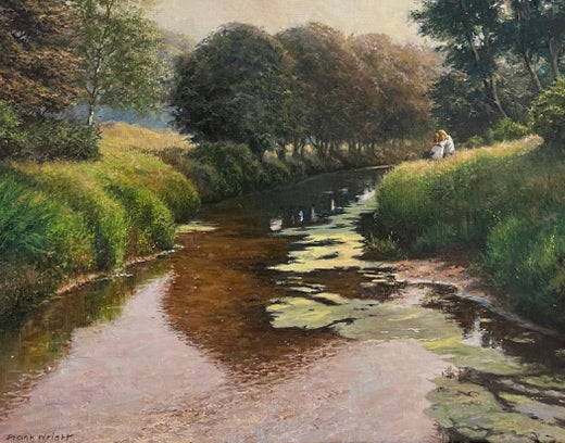 Frank WrightFino óleo firmado por un English Impressionist Amantes en la orilla de un río Campos de luz moteados