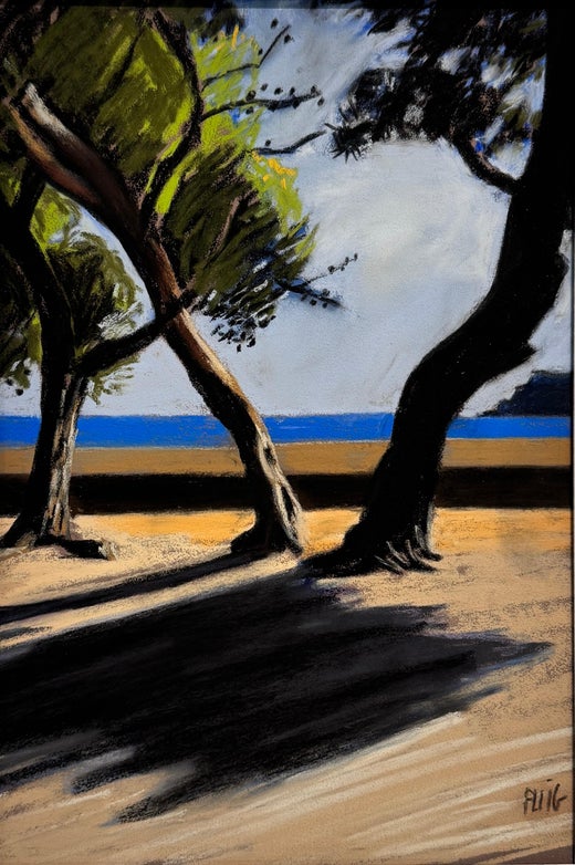 La ausencia de presencia humana refuerza la sensación de soledad y calma, ofreciendo una visión poética de un lugar preservado. Los trazos fuertes y texturados del pastel seco dan fuerza al dibujo, pues quería que la materia hablara tan claramente como el color.