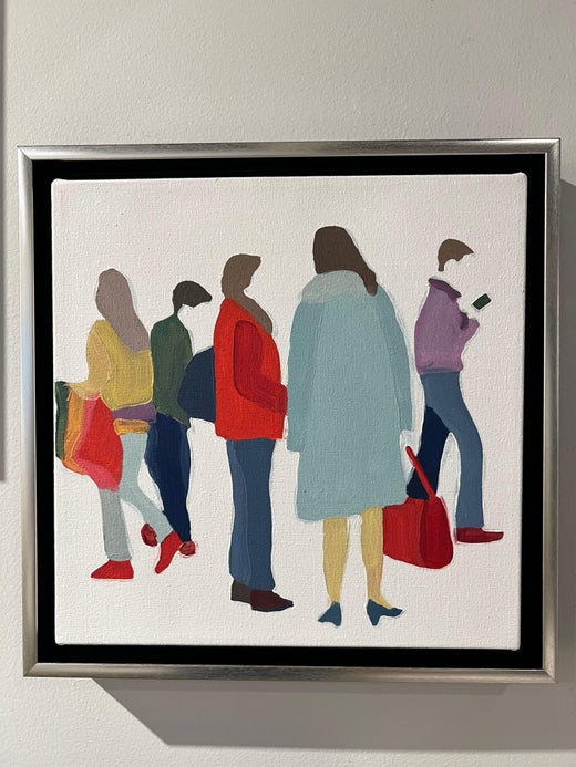 Los cuadros de Sherry unen figuración y abstracción, con una serie de colores bloqueados y formas abstractas que se combinan para producir una imagen de personas en grupos. La obra d...