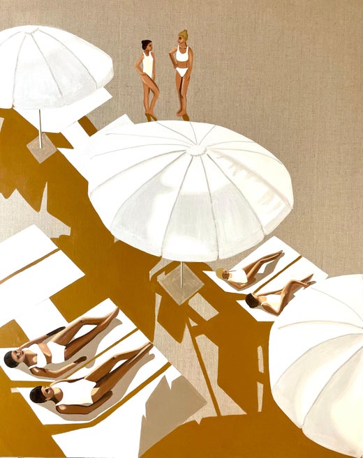 Pintura figurativa contemporánea en acrílico sobre lienzo de la artista polaca Joanna Woyda. La pintura es minimalista, de estilo pop art. La obra representa una tumbona en una playa...