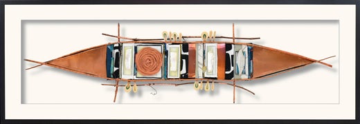 Una forma de canoa de cerámica perforada y marcada emerge de un zócalo junto a un tapiz de color azul y marrón claro que repite la forma vertical de la canoa. El título de esta obra ...