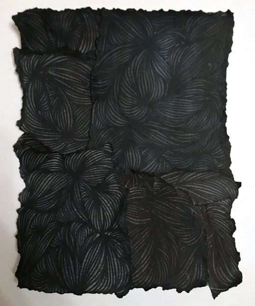 Collage abstracto contemporáneo de Charlotte Brown. Los artistas utilizan tinta y papel para crear patrones complejos. Líneas oscuras se arremolinan en la superficie de la obra, imprimiéndole una sensación de fluidez y vida.
