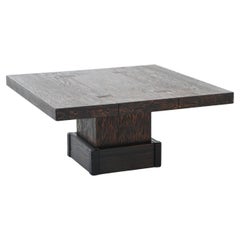 Esta mesa de centro brutalista combina una inserción circular de pizarra con un marco de madera maciza, creando un sorprendente contraste entre la piedra texturizada y la cálida made...